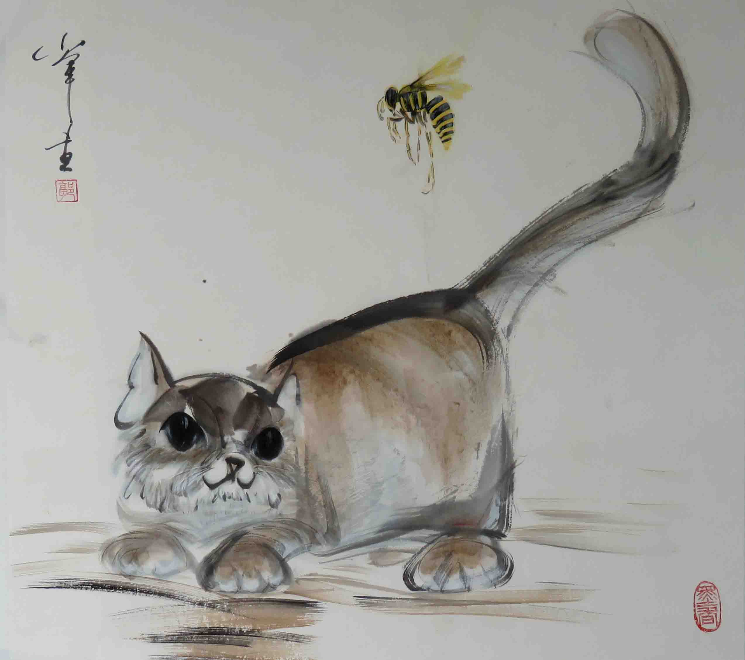 水墨动物画(猫与鸡雏)以及(斗鸡)被上海明园美术馆收藏。