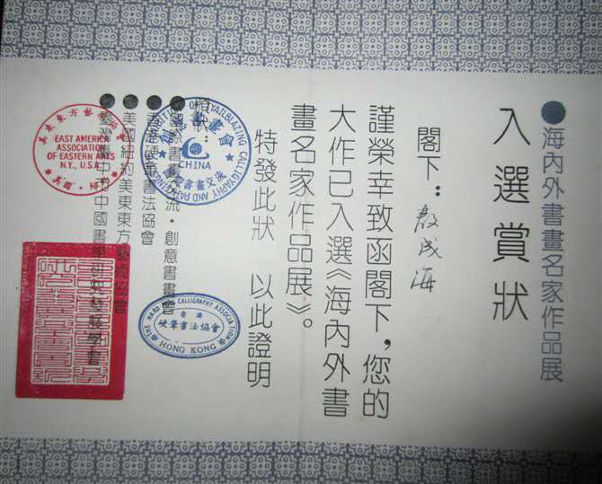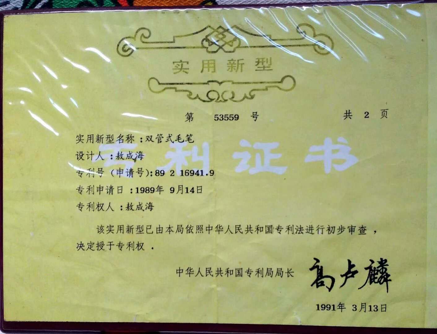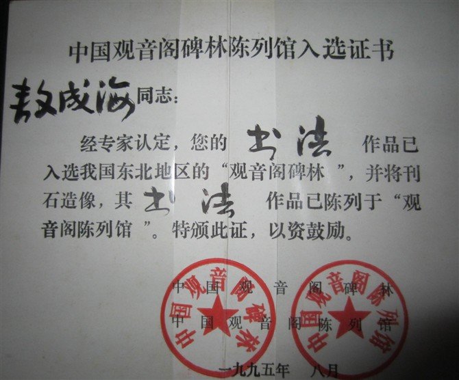 敖成海,1985—1987年在江苏无锡书法艺专学习。1989年发明“双管式毛笔”荣获国家发明专利。