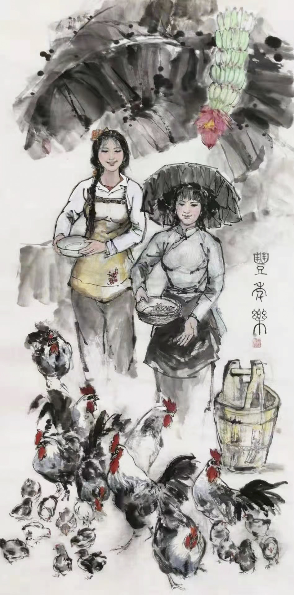 司徒惠霞老师的绘画题材以人物画为主。人物画画不同于山水画的讲究意境,而重在情趣。然而就人物画的情趣而言,其与笔墨的审美性,又少不了有着千丝万缕的关系。在司徒惠霞的画笔下,各式人物皆无不隐约着寓劲气于婀娜的书法意味,而不同的人物描画,则仿佛是中锋运笔的草书,既充满优美的运动感,又给人以“游丝之力更坚利多锋”的审美感受。所有这些,包括富于浓淡墨韵的泼洒,也皆服务于画面的整体布局和细微之处的精心描画,功力自然显现。