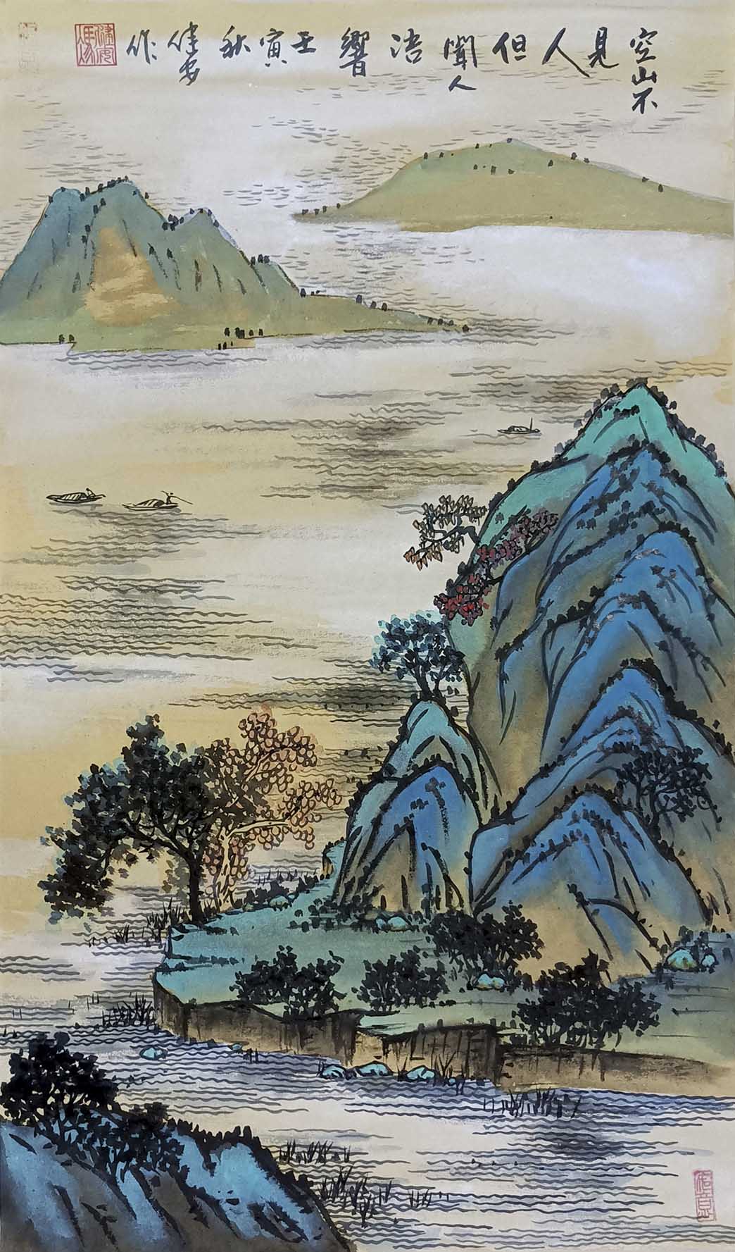 水墨层层复沓,积墨到七层八层,甚至十几层,也绝不会一塌胡涂,或是清虚流丽,或是苍润悦目,此法远师范宽,后学龚贤,亦有黄宾虹画法的精湛。山水画者,唯有像冯健安先生这样,依水为纽,作五彩焕神,才是气韵生动的典范。再赋青绿浅绛,或渲染浓墨重彩,在色不碍墨,墨不碍色的铺陈中,为山水构建起上突危峰,下览深谷的宏大空间,外师造化中得心源!