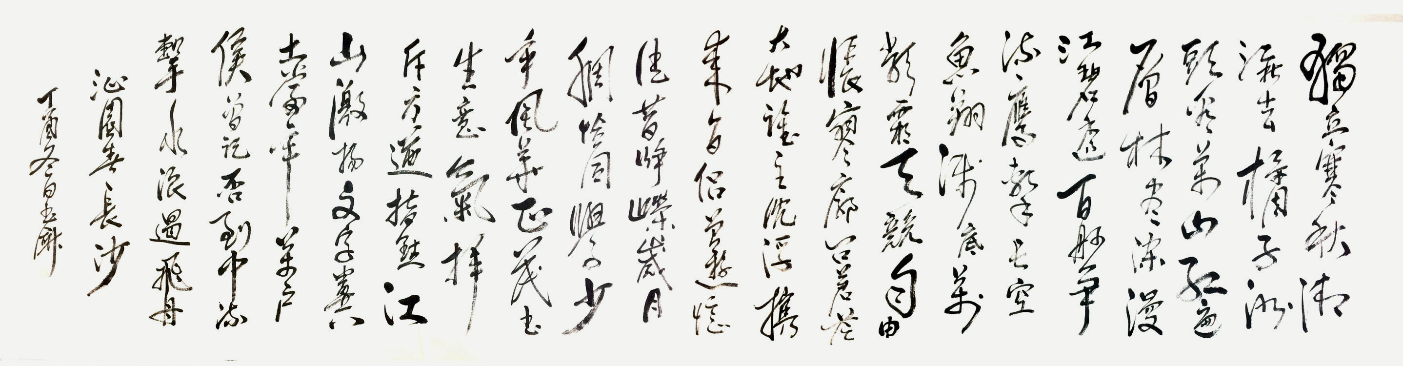 他的书法博涉多优,诸书皆有琢磨,尤以放手写心的行草为要妙。在他的笔墨挥纵之下,行草写透线条艺术的真谛,一笔拉过来如虬龙之蜿蜒,一笔纵过去是鸾凤之徘徊。通过提摁顿挫的巧妙组合,把书法线条表现出万千变化的神通。一画之内变起伏于锋梢,一点之间殊衄挫于毫芒。心手双畅,智巧兼优,写得同自然之妙有,非力运所能成!