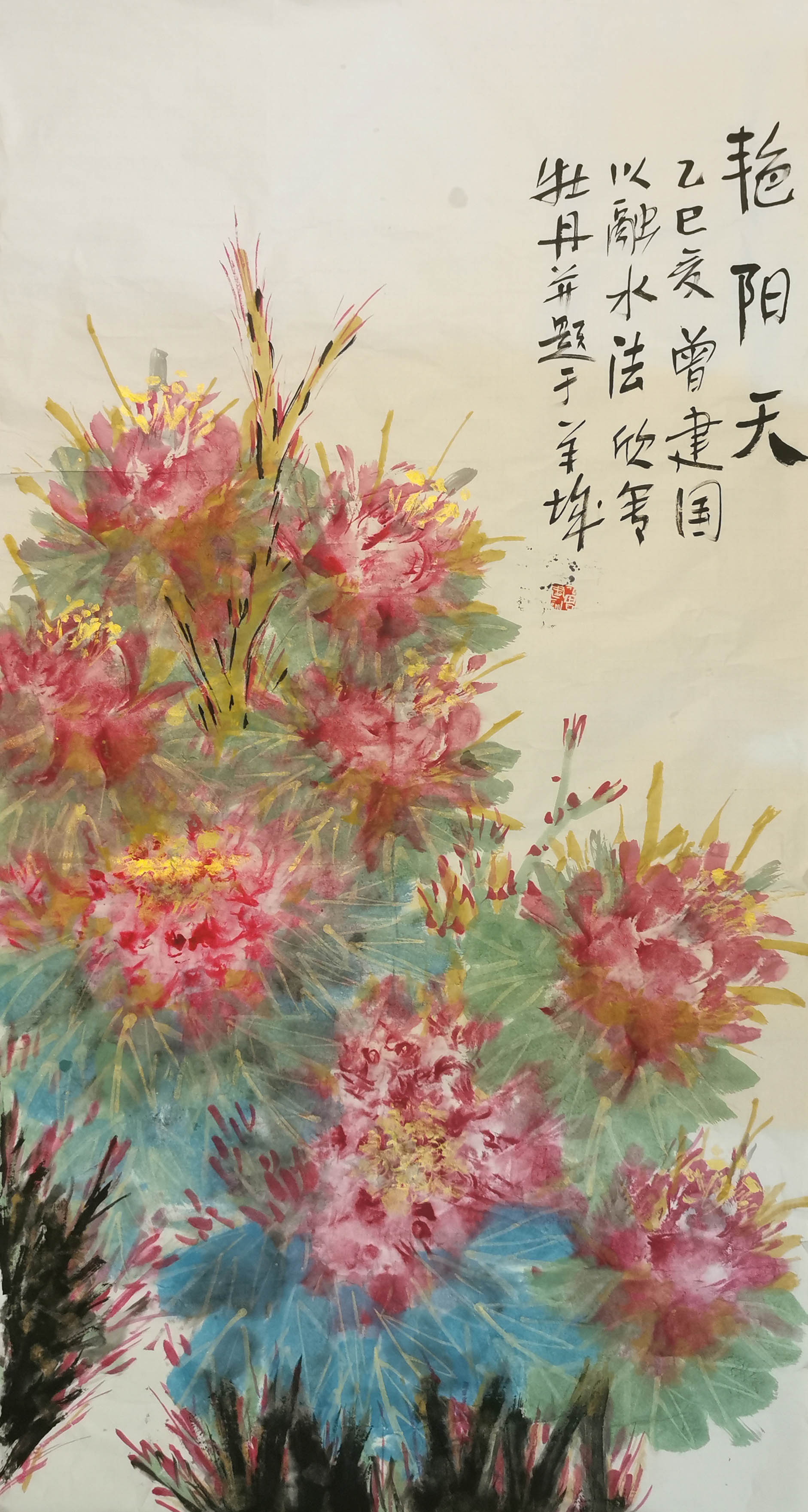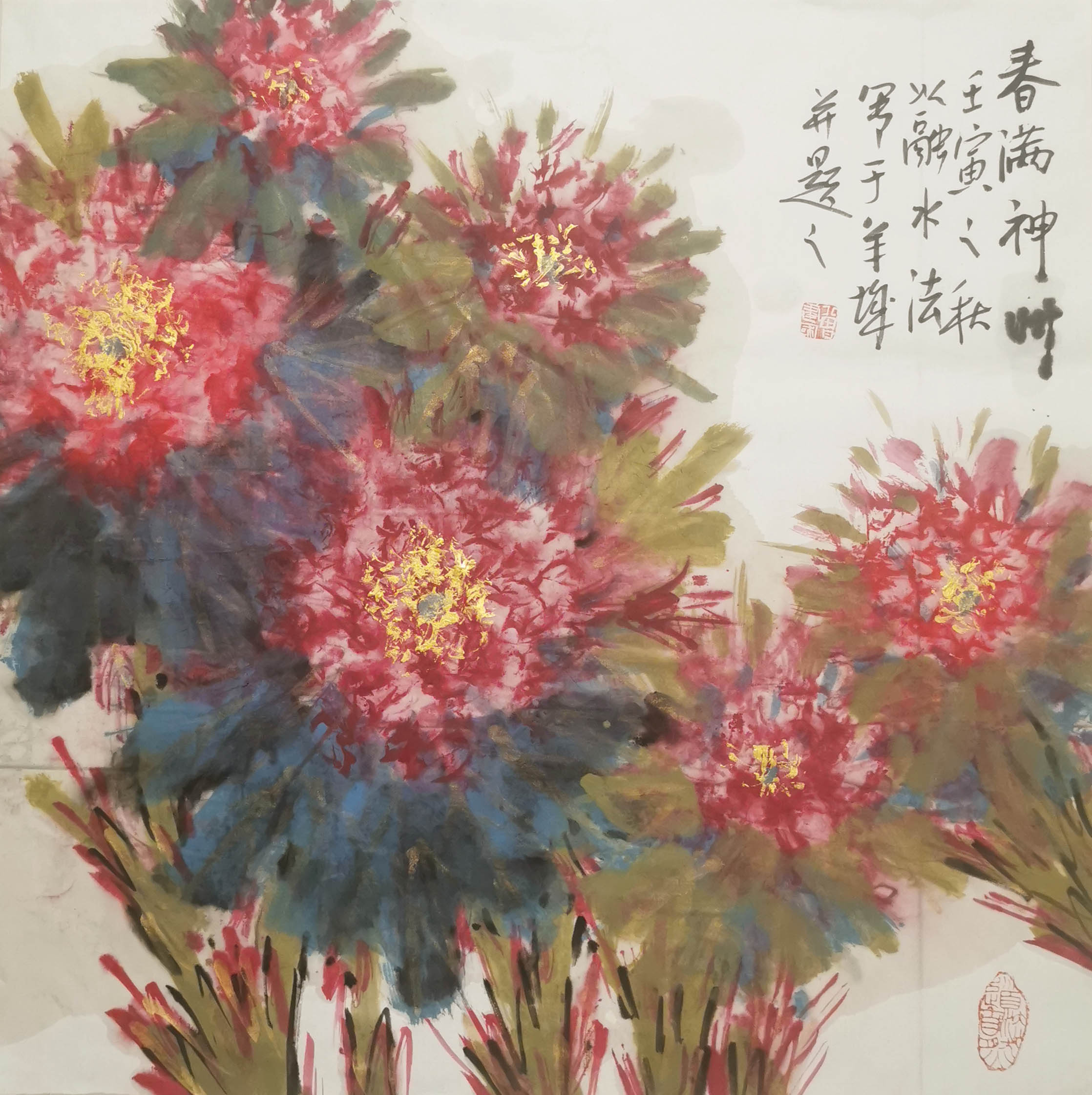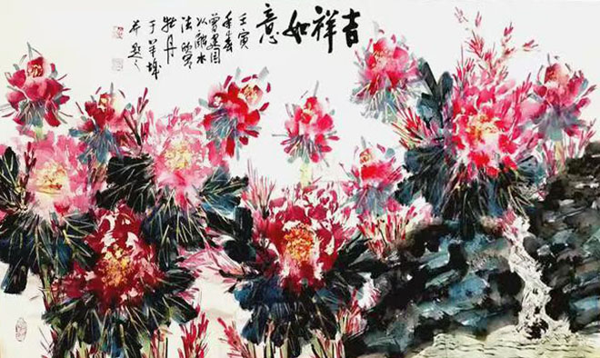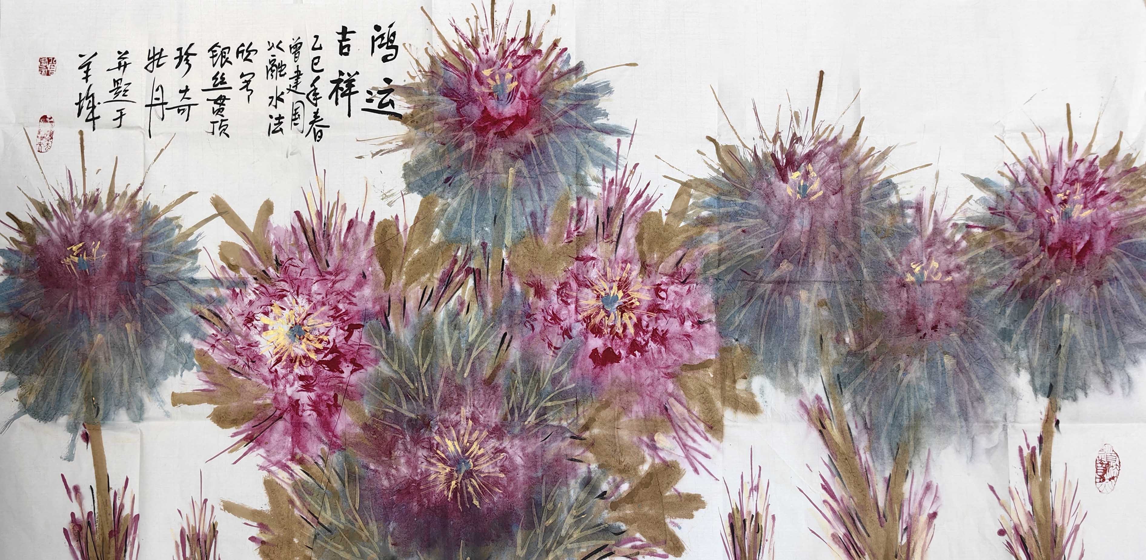 诗人、词人、楹联学家古稀之年的画家曾建国老师几十年的文化积淀丰厚的修养与内涵学识,对牡丹投入了十八年专事探索与研究,掌握了一套闭门绝技,了解中我得知是其在作画中大胆用水,以水为底,融于墨彩,一气呵成,半干湿中水与色墨三者互相浸润,自然融合,出乎意料之外又合乎情理之中让画面盛放的牡丹花,便有了深邃多维多变的质感。再通过激情投入率性用笔,运用中锋侧锋和点染等传统笔法,又大胆探索散锋凿笔和侧锋的转笔法,令笔法多变,笔痕鲜明,肌理丰富从而使画面花瓣更为丰富和变幻,进入到艺术创作的最高境界,"似与不似,不似更似"增加了牡丹花新的主题观念和审美意识,最终从传统走向当代,对历代牡丹花作品赋予了新的内涵与生命力,与泛泛而作的牡丹花作品擦身而过,大有同而不同师大雄的超然解读,既不是“具象”,又不是抽象而是“意象”,将牡丹的形态和气质意象化,如梦如幻 .产生了神秘、新奇、惊艳的美感,有如现当代LED“激光”的炫彩效果,给人们带来全新的视觉体验享受,让牡丹更具个性,更具独创性,更显高贵和典雅,更加迷人和诱惑,更加高尚和庄重的魅力与视觉效果。