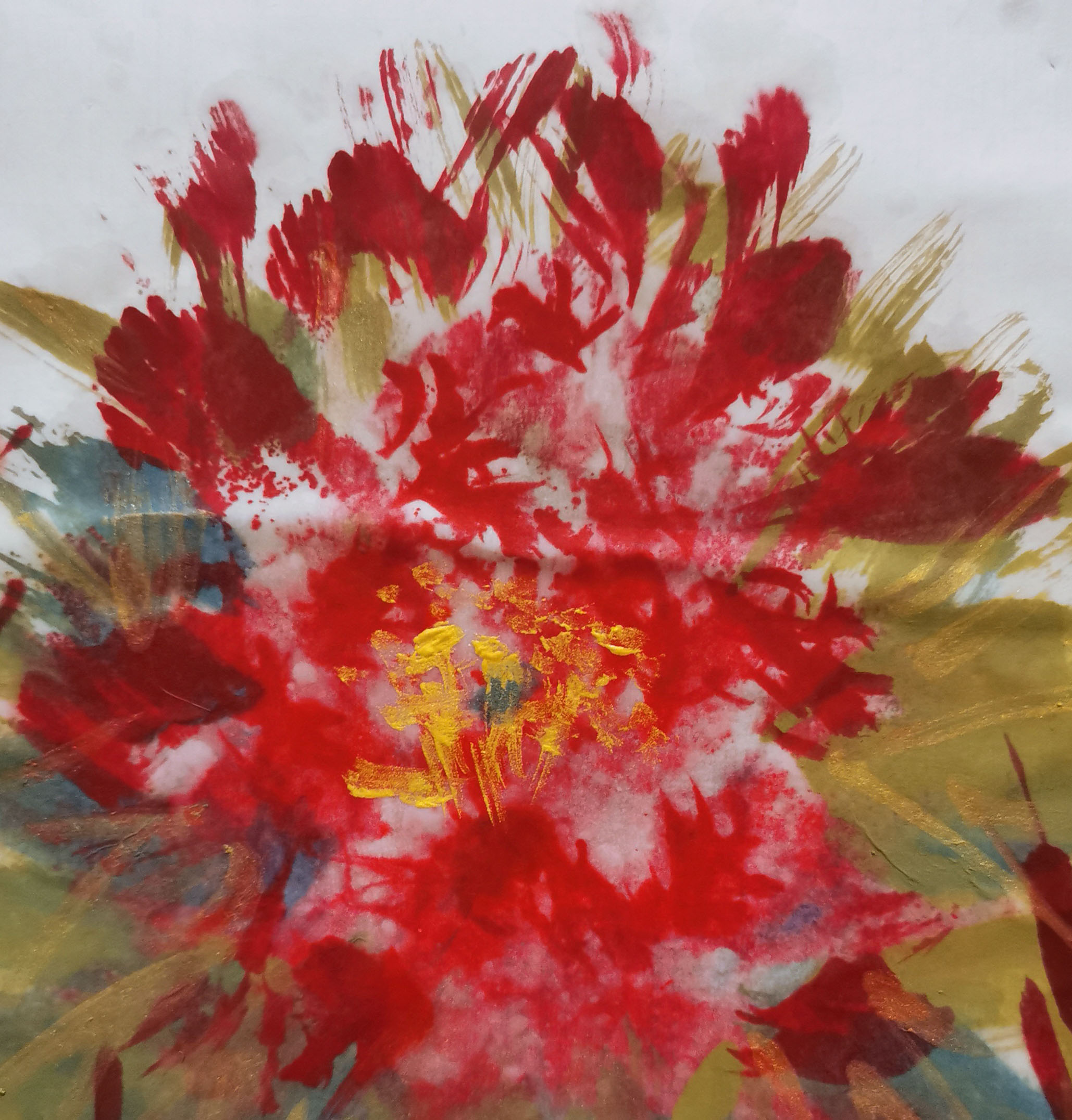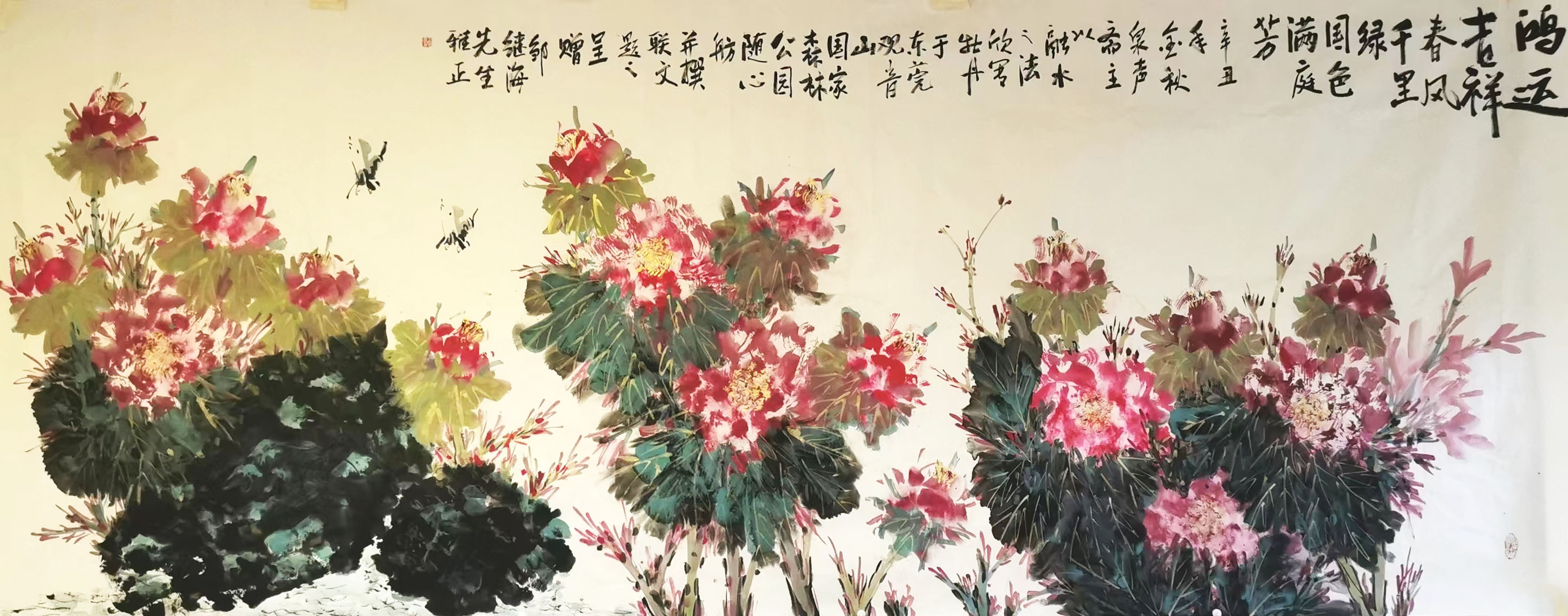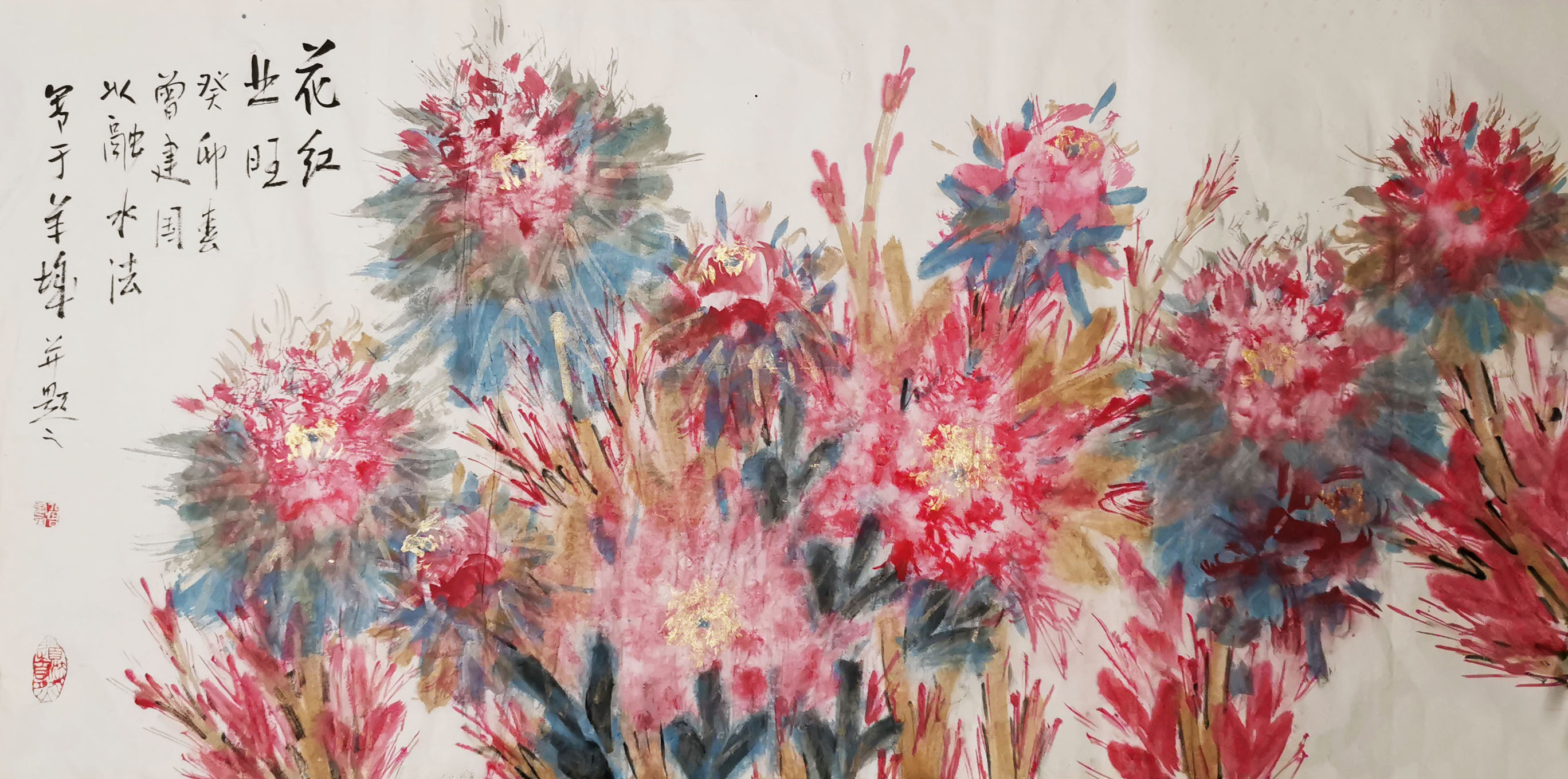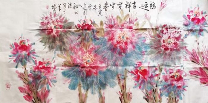诗人、词人、楹联学家古稀之年的画家曾建国老师几十年的文化积淀丰厚的修养与内涵学识,对牡丹投入了十八年专事探索与研究,掌握了一套闭门绝技,了解中我得知是其在作画中大胆用水,以水为底,融于墨彩,一气呵成,半干湿中水与色墨三者互相浸润,自然融合,出乎意料之外又合乎情理之中让画面盛放的牡丹花,便有了深邃多维多变的质感。再通过激情投入率性用笔,运用中锋侧锋和点染等传统笔法,又大胆探索散锋凿笔和侧锋的转笔法,令笔法多变,笔痕鲜明,肌理丰富从而使画面花瓣更为丰富和变幻,进入到艺术创作的最高境界,"似与不似,不似更似"增加了牡丹花新的主题观念和审美意识,最终从传统走向当代,对历代牡丹花作品赋予了新的内涵与生命力,与泛泛而作的牡丹花作品擦身而过,大有同而不同师大雄的超然解读,既不是“具象”,又不是抽象而是“意象”,将牡丹的形态和气质意象化,如梦如幻 .产生了神秘、新奇、惊艳的美感,有如现当代LED“激光”的炫彩效果,给人们带来全新的视觉体验享受,让牡丹更具个性,更具独创性,更显高贵和典雅,更加迷人和诱惑,更加高尚和庄重的魅力与视觉效果。