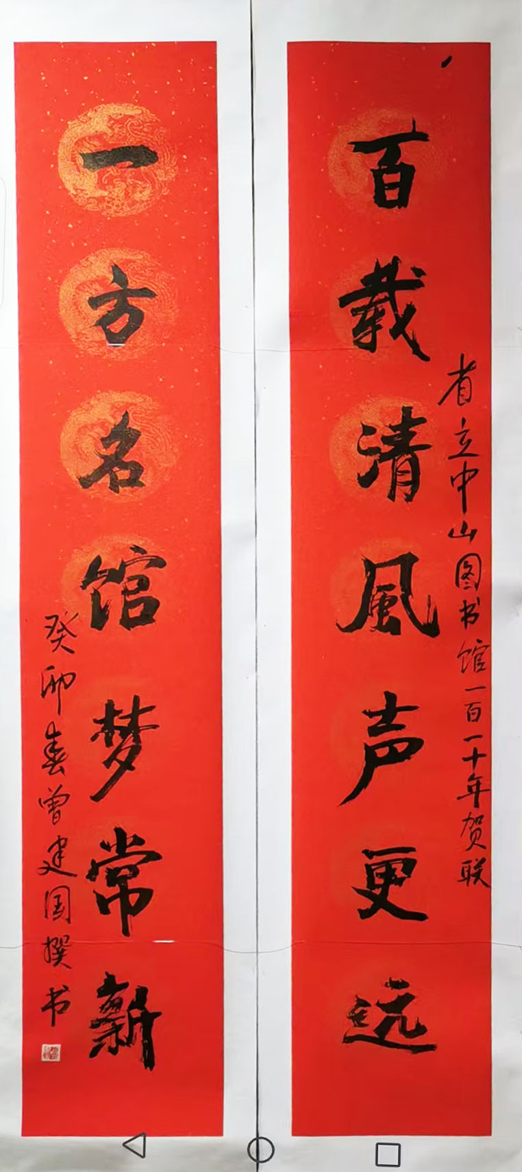 作为中国楹联学会顾问、广东楹联学会会长,曾建国擅长短联创作,娴熟运用借喻、嵌字、对比、叠字等艺术手法,联句朴实却情感丰沛,如“客家娘酒”般令人回味。他的诗词同样充满哲思与情怀,如《融水法写牡丹有感》中“笔端散乱随心写,意象清明任笔行”,展现了其创作的自由与境界。
