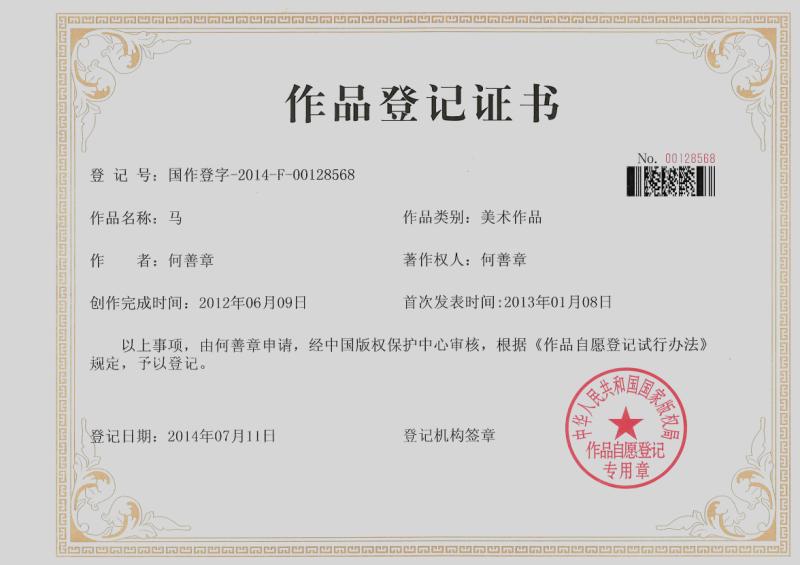 何善章所创作的“马” 字鬃飞蹄张,形象生动,已于2013年1月获得国家版权局的《作品登记证书》。他表示,他创作时首先想到人们心中的马是勇往直前,骏马腾飞,马到功成的千里马,所以我就以千里马的标准来创作。在章法上也有讲究,传统落款一般在左边,考虑到要给千里马有足够的空间任其奔腾,落款放在了右边。”同理,他的《龙》字如同一条蛟龙腾云驾雾,而他的《厚道》二字则厚重如磐石。