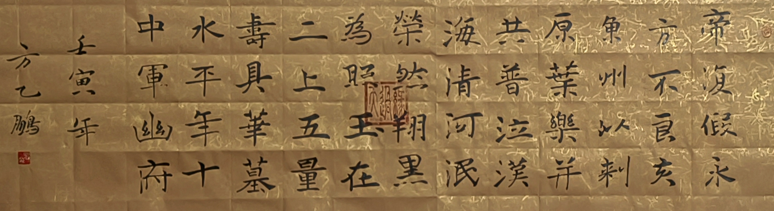 1996年拜贤者德高望重书法恩师“方长老师”为师。经过正师正法“方长老师”专业严导指引技巧学习的方法,每天风雨不改坚持刻苦钻研学习艺术的精髓,经过在漫长的岁月中,“方乙鹏”特长各种(魏碑、楷书、行书、草书、篆书、隶书、甲骨文、金文、鼎文、鸟兽文……)古今字体,将“书法艺术、篆刻艺术、硬笔艺术等学以致用。使命重任将中华上下五千年文明文化精髓传承而延续下去!”