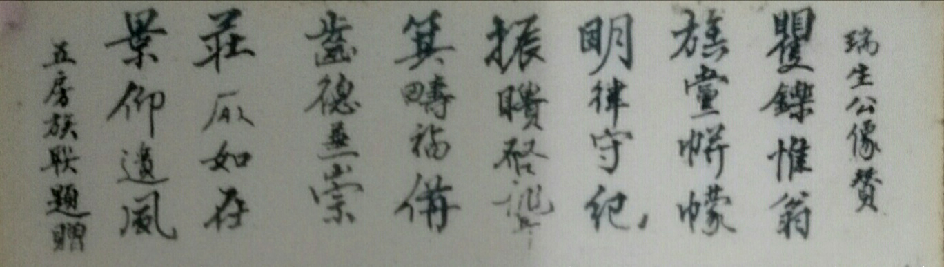 故后当地人联题像赞曰:瞿铄唯翁,族党帡幪,明律守纪,振聩启聋,箕筹福备,齿德兼崇,庄严如存,景仰遗风。