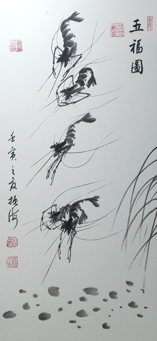 金墨虾-虾趣,2014年,中法建交50周年,作品被选送到法国卢浮宫参展;2022年再次走出国门,被称为中华丹青巨匠,被人民大会堂收藏。