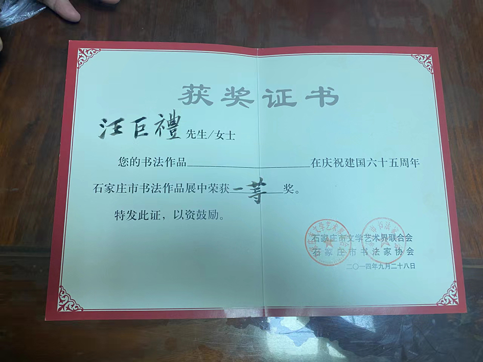 2014年汪巨礼的书法作品在庆祝建国六十五周年石家庄市书法作品展中获一等奖