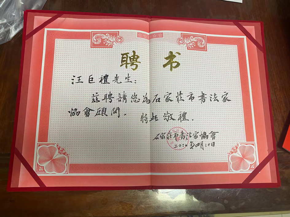 2020年石家庄市书法协会聘请为石家庄市书法家协会顾问