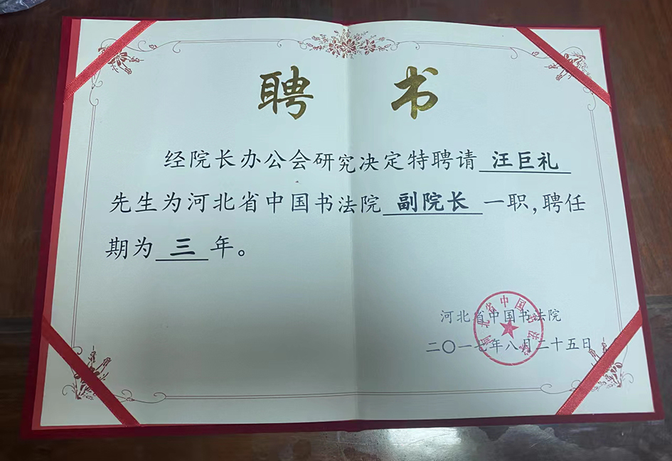 2017年河北省中国书法院聘请为河北省中国书法院副院长