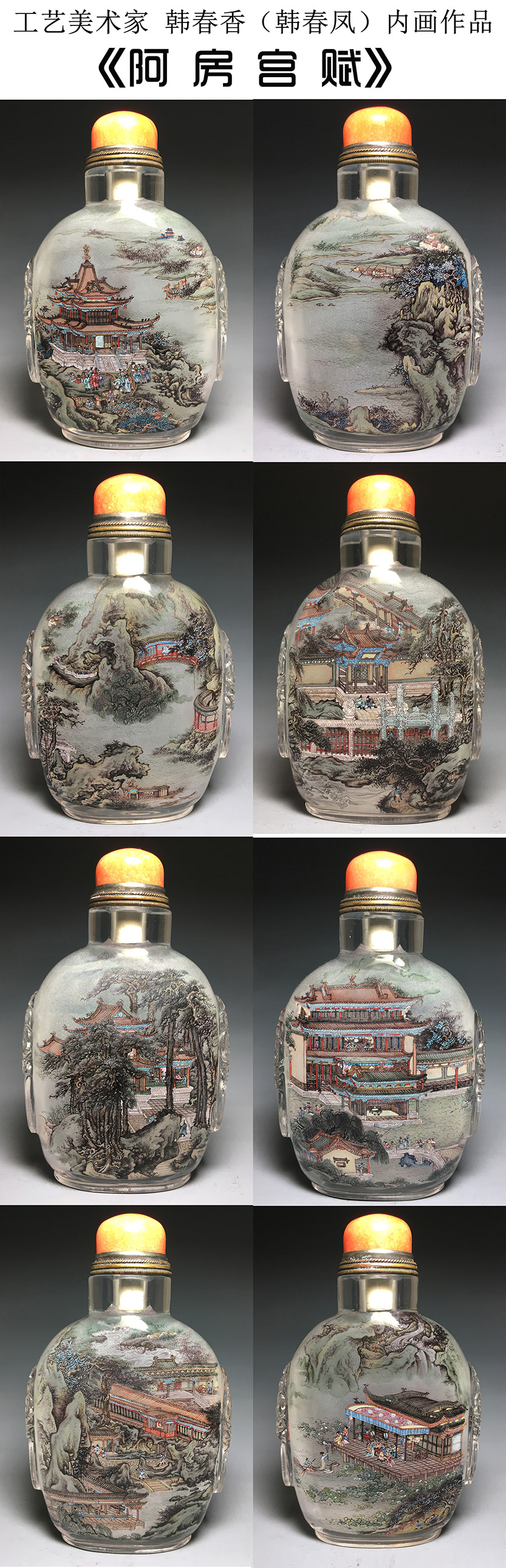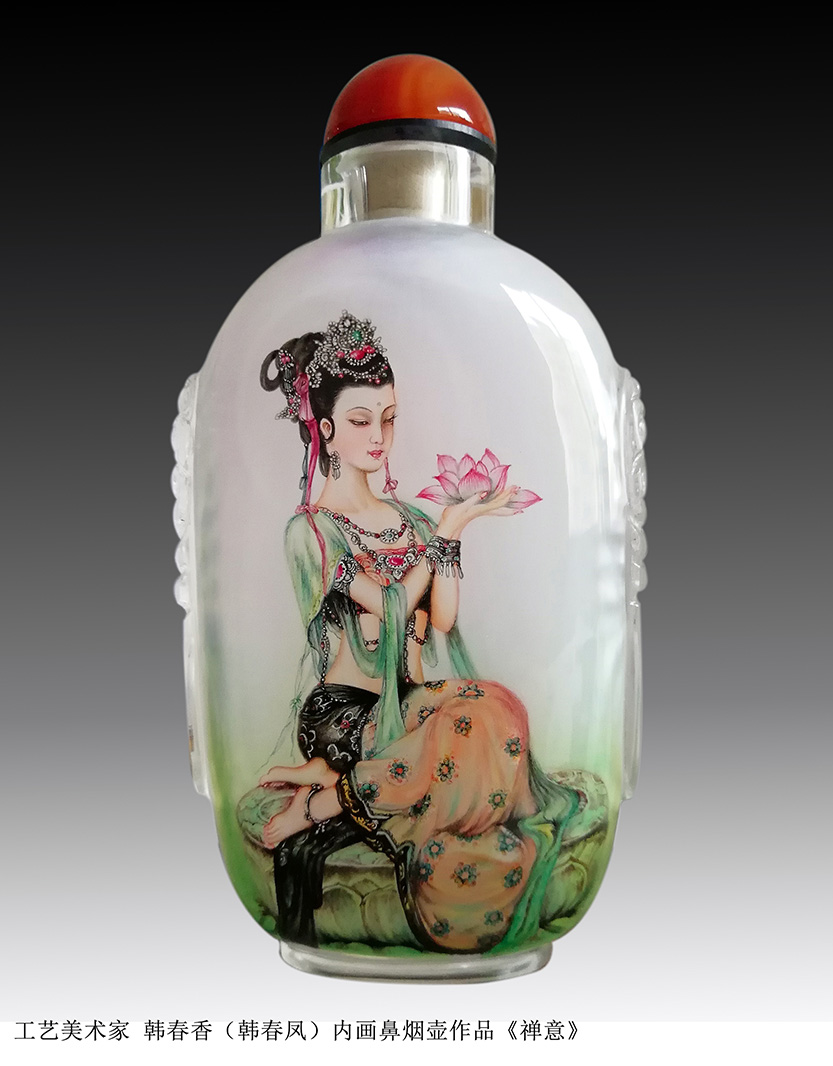 韩春香,又名韩春凤,1979年生于河北省河间市。自幼酷爱绘画,1998年开始学习内画,得多位京、冀各派内画名家的精心指导。2017年,为更好的提高内画技艺,学习专业的国画知识,于沧州师范学院美术系进修国画,得到专业老师悉心指导。2018年正式拜中国内画艺术大师董雪先生为师,孜孜不倦以求内画艺术精进。绘画题材广泛,擅长工笔花鸟、山水、人物等,作品风格独特,创意新颖,清新淡雅,笔法功力深厚细腻,造型动态准确。曾获得众多工艺品设计大师的赞誉,完美无瑕的作品和独特的创作风格引发了内画爱好者的广泛关注。面对大家的赞誉,韩春香始终保持一颗平常心,坚持自己的创作理念,将自己的构想一步步转化成精妙绝伦的艺术品。近几年逐渐被内画收藏界推崇为最具潜力的中国年轻画家。
