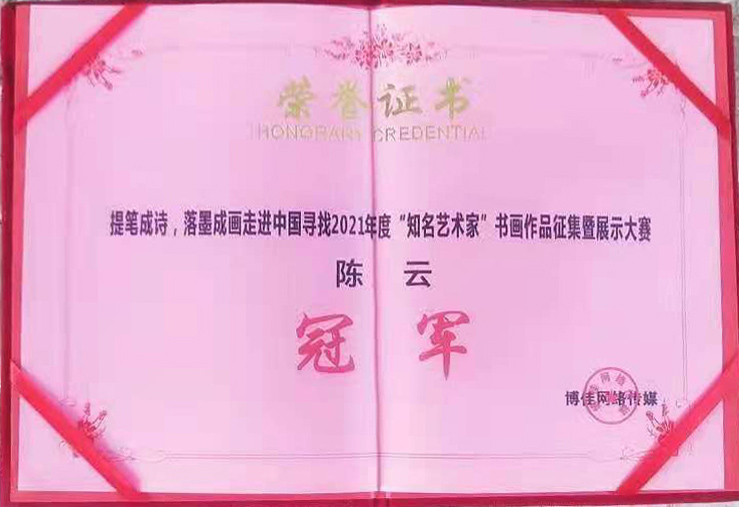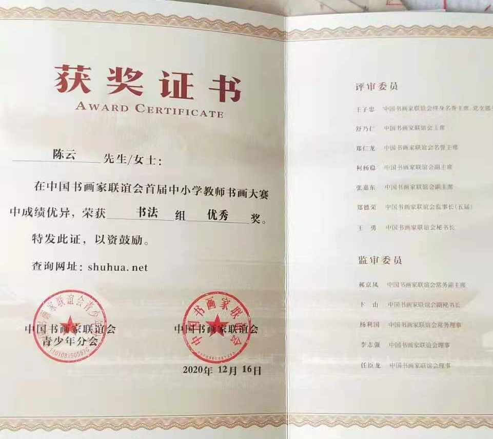 陈云,笔名陈恬,中国书画家联谊会认证书法师,中国书画家联谊会书画教育工作委员会理事,中国书画家联谊会青少年分会理事,中国硬笔书法协会会员,认证书法教师,河南省硬笔研宄院硏宄员现从事书法教育,中国硬笔书法协会书法教育会员单位,河南省硬笔研究员单位中国书画家联谊会青少年书画测评基地本人走遍各省市学习书法15年余,所得。