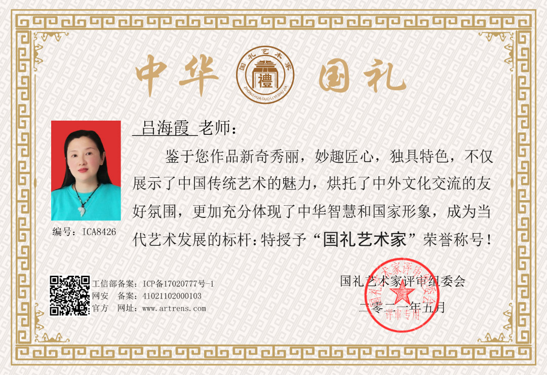 2021年因其作品新奇秀丽,妙趣匠心,独具特色,不仅展示了中国传统艺术的魅力,烘托了中外文化交流的友好氛围,更加充分体现了中华智慧和国家形象,成为当代艺术发展的标杆,经国礼艺术家鉴定评审组委会和国礼艺术家网委员会评审,特授予“国礼艺术家”荣誉称号。