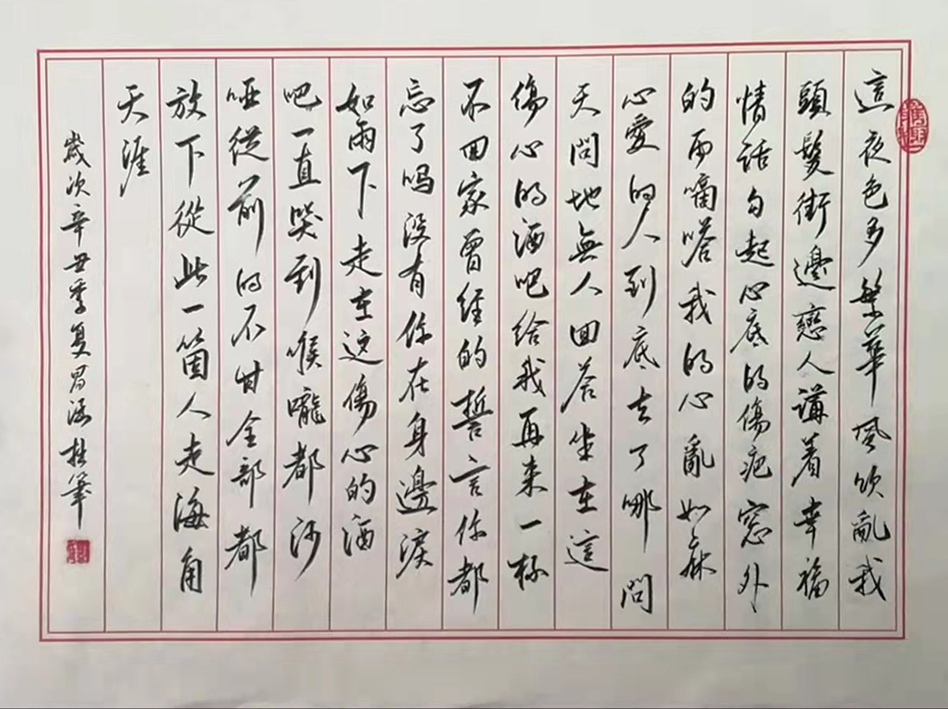 20多年来,他遍临古代名家碑帖,打下了扎实的基础,经过勤奋刻苦和坚持不懈的努力,自学成才。在校和单位期间负责版报宣传编辑工作,曾被领导多次表彰,后又跟随当代书法名家赵贺新、田英章之子田雪松、荆霄鹏等多位名家学习软笔和硬笔书法,对毛笔、签字笔、钢笔、粉笔、秀丽笔等不同书写工具的不完全相同的书写笔法都有研究。无论是在校、在单位还是社会上组织的硬笔书法比赛中,均多次获奖。