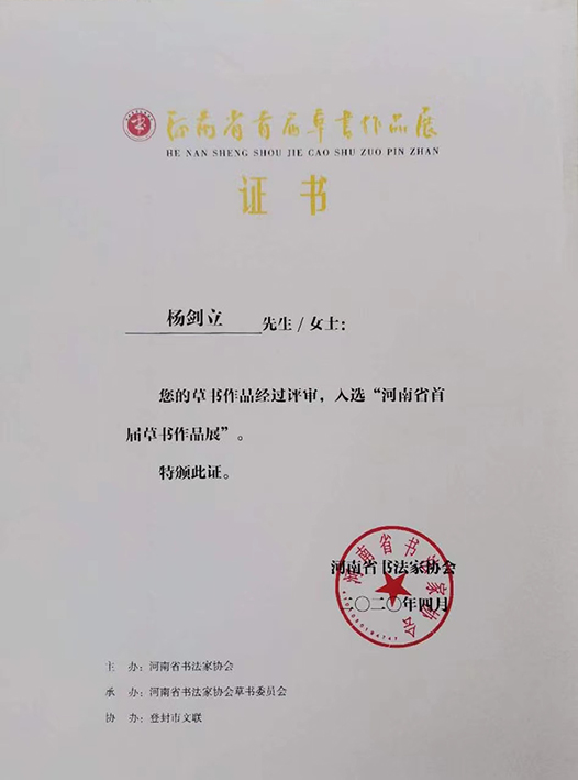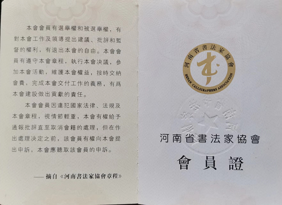 中国当代实力派书法家,国家一级书法师,中国书画家协会理事,中国名家书画艺术品交流基地特邀顾问,河南省书法家协会会员,平顶山市书法家协会草书委员会委员