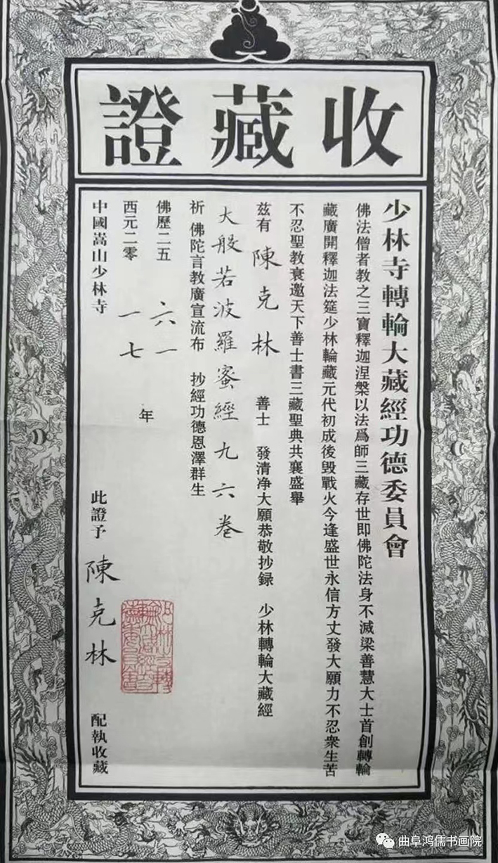 2017年〔佛历2561年〕受邀为少林寺抄写《转轮大藏经》第96卷,现存放于少林寺藏经阁,并颁发收藏证书。