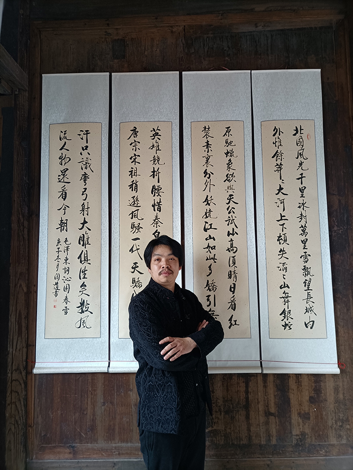 幼承庭训,酷爱中国绝艺诗书画,从事传统手工装裱数十年,自感书画之道之深远。逐援笔自楷而习起,并拜各地名家为师,后专攻著名书法大家启功书体,作品得到专家一致好评,被港•澳•台,日本及海外人士收藏。2020年获得全国二十届“庐山杯”书画大赛金奖;