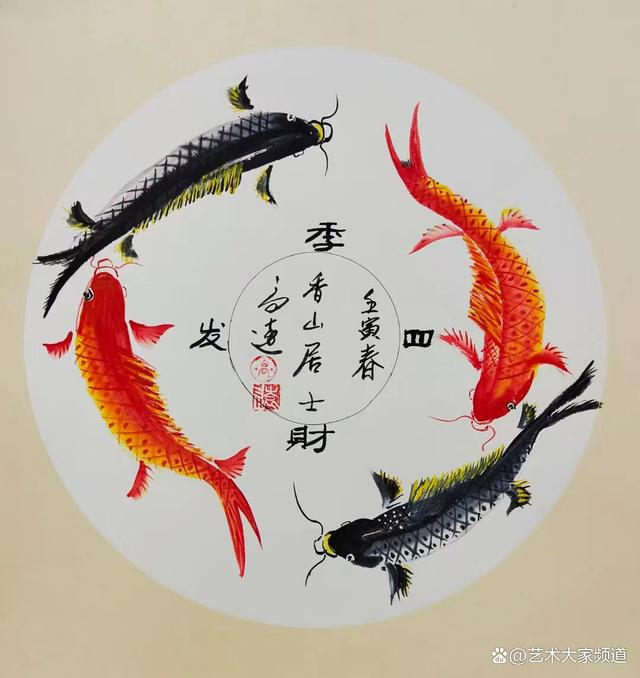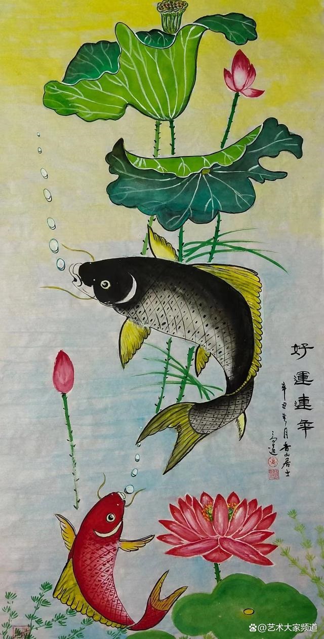 我观《鸿运当头》回首白云低,举头近红日。这旭日东升,云烟浩荡的万象气象,果然是地接衡庐的巍巍壮观。挂一件在厅堂,必然展鸿迎运,吉祥如意。又见花鸟作品《锦吉福富》一条,兼工带写可以夺物象之精神,能够掠物象之体貌,浑厚华滋之品,雅俗共赏之功,当然令人赏心悦目,大振心颜!
