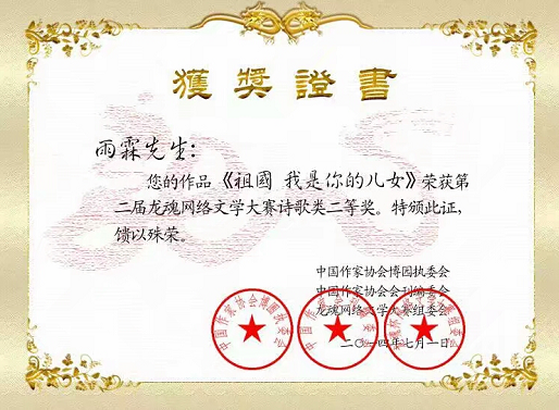 雨霖:原名王馨。祖籍河南洛阳,现旅居浙江义乌。教书。喜欢文学。网易写博。当代作家会员,世界华文作家协会会员,签约作家。有诗歌散文作品100篇首发表,散见《中国作家协会会刊》《舞蹈中国梦》《星星》等诗刊,《长江诗歌报》专版重点推荐诗人。《东坡风》杂志社栏目特约主编。闲暇时间喜欢书法绘画,楷行草兼修。1996年被洛阳市新安县书法协会吸纳为新安县书法协会会员,后闲暇勤笔不辍。2014年获香港书法协会浙江省分会协会副会长。中国硬笔书法协会会员。中国硬笔书法培训师。