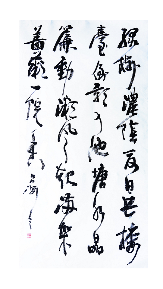 吕海令的行草书不追求形体结构上的稳健和精严,而是追求一种笔墨的放纵洒脱,力图摆脱传统书法的陈旧框架而能出新意。因此,他的字虽然不研媚俊逸,却俊迈豪纵,以笔墨的浓淡枯湿变化和笔画的银钩铁画的姿态布置,表达书家内心意在笔先,出笔转折跳荡,不受羁绊,尽得风流的深切体会。