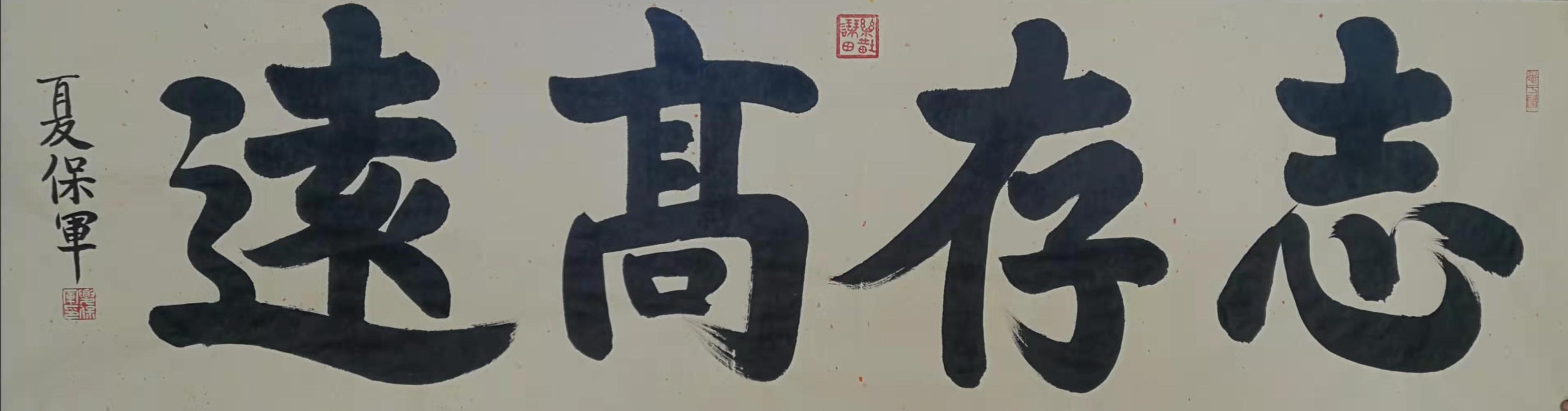 他坚守豪气。夏先生研习书法多年,临池不辍,尤其钟爱榜书,临摹古代匾额。榜书的特点是厚重雄壮,沉稳有力,给人信心,鼓舞向上。夏先生书写榜书,结构谨密,运笔圆润,力透纸背,彰显豪气大方。