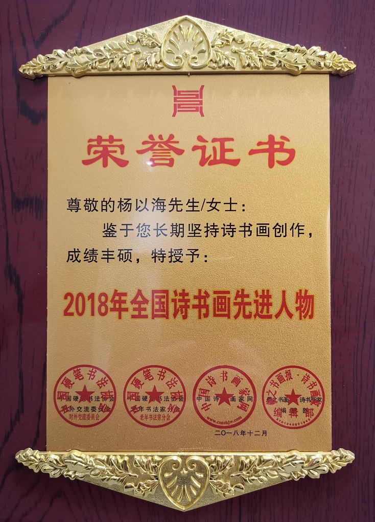 杨以海,男,艺号海洋,河南光山人,大学本科学历,军旅25载,团职,军队转业后任职郑州市市政府一单位党委书记。现为中国硬笔书法协会会员、中国教育电视台水墨丹青书画院会员、河南省书法家协会会员、郑州市书法家协会会员、河南中原风书画艺术研究院会员。