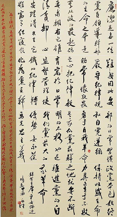 在多年习练书法以来,始终坚持弘扬祖国的书法艺术,坚持不懈的学习书法,以二王、宋四家为根基,博学众家之长,集思广益,以书会友。从不刻意追求视觉的平淡与模糊,而是学习传统的碑帖临摹,细研注入自己心灵感悟与海纳百川的博大胸怀。注重笔墨情感的抒发和内在的丰富笔法表现力,崇尚道法自然,与古为新、与古为徒。在翰林砚田耕耘中,以笔当歌,抒发情怀,豪情绽放,把书法艺术传承下去,不忘初心为书法,追梦兰亭,在新时代继承中华传统文化,与兰亭会同行,薪火相传,谱写书法艺术的新篇章。