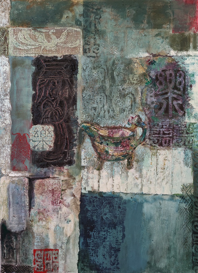 敦煌与龙门石窟,都是最典型的远东佛教石窟文化遗址。我这一系 列作品均以此为两个创作基础。虽有三幅主题为梅花瓶和青铜器 皿的作品,但其画面元素仍离不开敦煌壁画。表现的都是古老的丝 绸之路上,从东欧、中亚、西亚到东亚一带经历和沉淀下来的艺术 之美。都对这些历史遗韵,无论是文字、是佛像,进行了艺术上的 重组,和延续。
