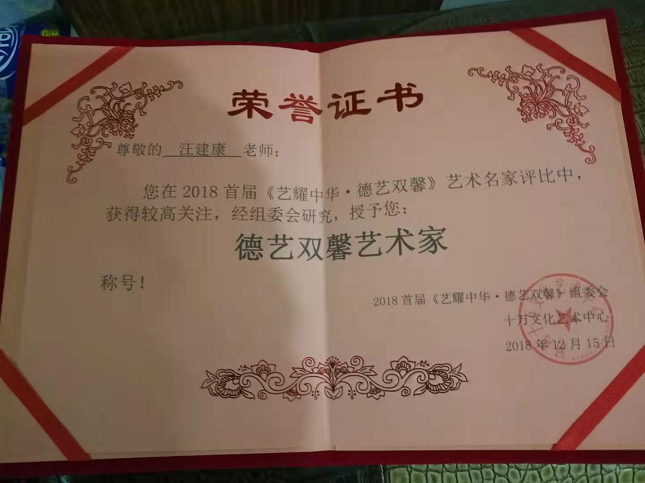 汪建康先后被全国微信网民和国家文化主管部门评选颁发“功勋艺术家”、“建党百周年人民优秀艺术家”、“德艺双馨艺术家”、“国宝艺术家”、“中国当代最具投资收藏价值艺术家”、“中国世代传承艺术名家”、“国礼艺术家”、“中国艺术泰斗”、“中华新时代榜样人物”、“中华文化复兴践行者”等诸多光荣称号。