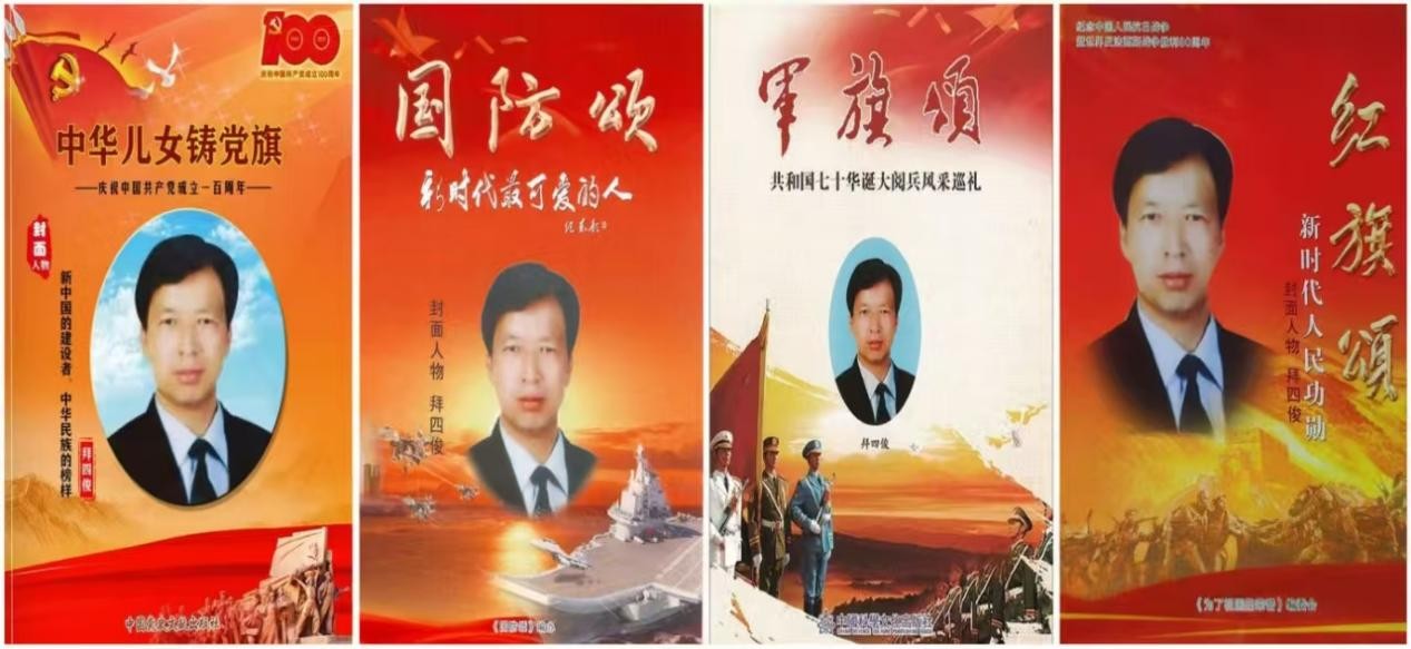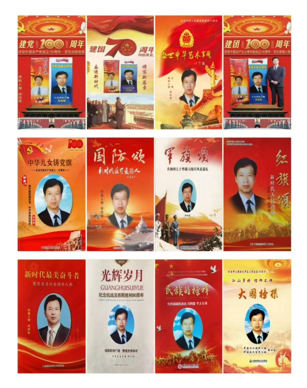 他是《党旗颂》《国防颂》《军旗颂》《中国榜样》《中国正能量》《时代颂歌》《祖国赞歌》《大国崛起》《创业先锋》《走进新时代》《我的中国心》《为祖国喝彩》《华夏功勋人物》《中国形象人物》《中国党风廉政建设先进人物》《中国国家艺术家》《世界艺圣》《为了祖国的荣誉•英雄模范功臣谱》《红旗先锋•时代先锋人物》《新时代理论创新人物》《人民的好儿女》《共和国英雄礼赞》《70年•70人纪念画册》《建国70周年•70位风云人物》《百年丰碑颂英模》《中共百年功模人物志》《中共百年获奖作品精选》《红旗先锋•百年大党群英谱》《大国军魂•国防英贤谱》《报国楷模•奋进新时代》《人民的荣光•数风流人物》《永恒的旗帜•共和国时代先锋人物》《盛世中华•艺术军魂》《建党百年•百位功勋党员》《建团百年•百位英模人物》等唯一封面人物。