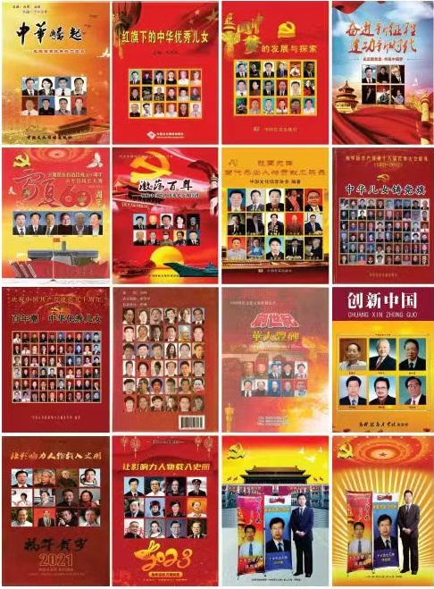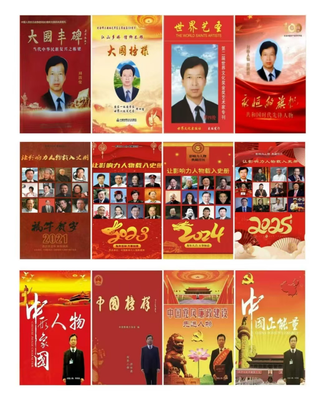 他是《中国梦的发展与探索》《中国梦•中华人物名录》首位人物;《改革开放40周年•40位风云人物》封二人物;《一带一路•风云人物》封二人物;《祖国先锋》和《党旗颂》第二人物;《科学发展在中国》第三人物;《中国特色社会主义理论与实践》第四人物;他是纪念辛亥革命100周年《百年中华重要贡献人物》、纪念毛泽东诞辰120周年《中华英才缅怀领袖毛泽东》和纪念邓小平诞辰110周年《改革开放的领航者》重点宣传人物;他在130部中国人物大典中榜上有名,在9部世界人物大典中留下了名影。