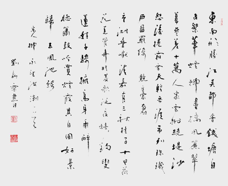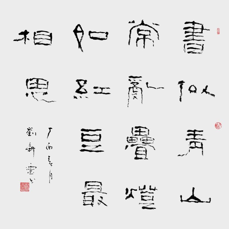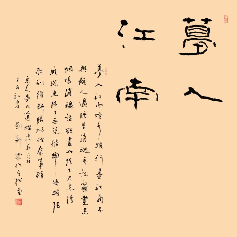 刘新灵, 斋号守拙堂,河南驻马店人。上世纪80年代初从戎,得海军指挥学院院长王玉峰将军启蒙,先后得到萧娴、陈大羽、武中奇等名师教诲。后师从林散之弟子、书画名家章炳文先生。现为中国书画研究院高级书画师、江苏省书法家协会会员、江苏省书法研究院特聘书法家、东方艺术学院名誉院长、南京市浦口区书法家协会副主席。作品多次入选中书协及省市书法展,多次参加中日、中韩、中新书法交流展并获奖。作品入编《中国当代实力派书画代表典库》、《中国当代书画精品典藏》、《中国现代书画篆刻名人录》。被授予“全国杰出艺术家”、“全国书画界百名德艺双馨奖”、“中国当代书坛画苑中坚人物”等称号。