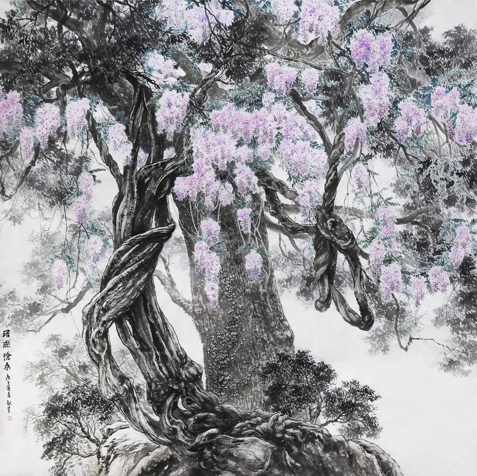1987年,创作《汉柏图》《六朝古松》《雁山听瀑图》等。