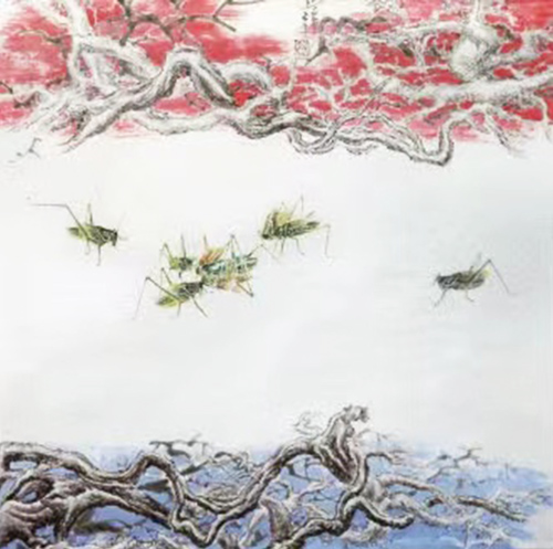 他另辟蹊径,吸收了西画的构成元素,在对称中求不对称,在矛盾中求统一。画面上做加减法,加处不能再加,减处不能再减,使画面既险又安,既冲突又平和。构图中的一根线、一块墨,与空间存在都趋向完美,工细处纤毫毕现。