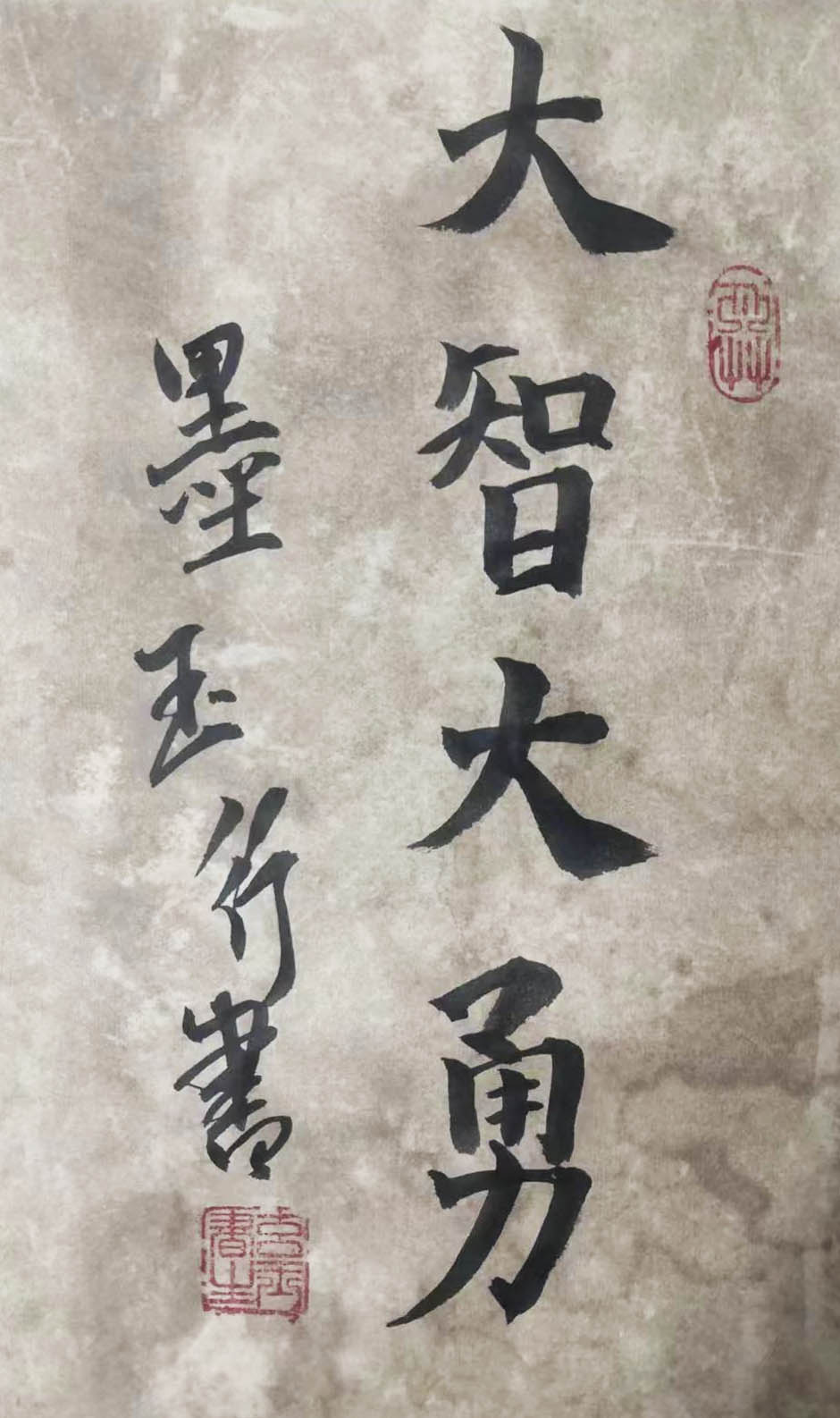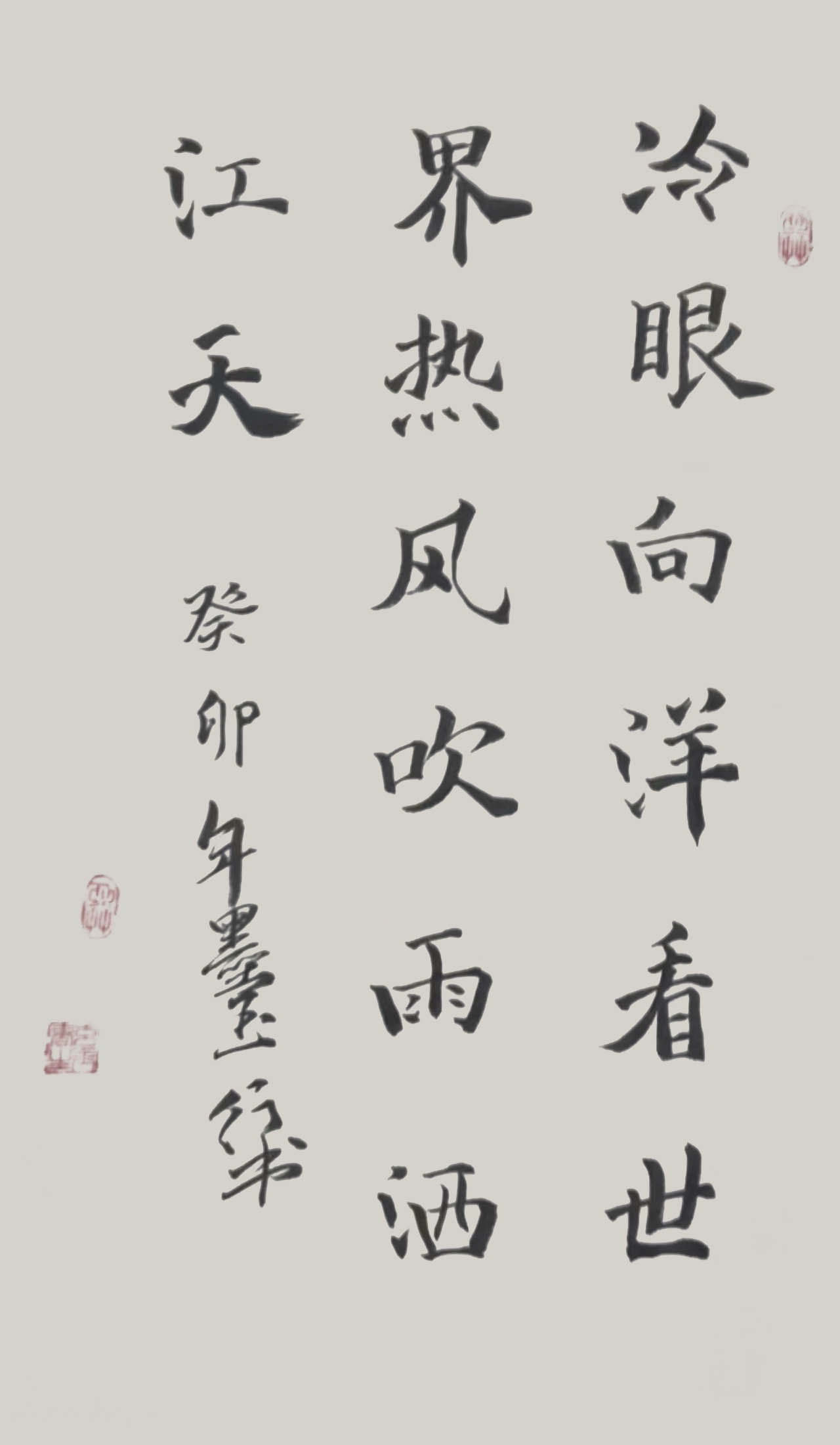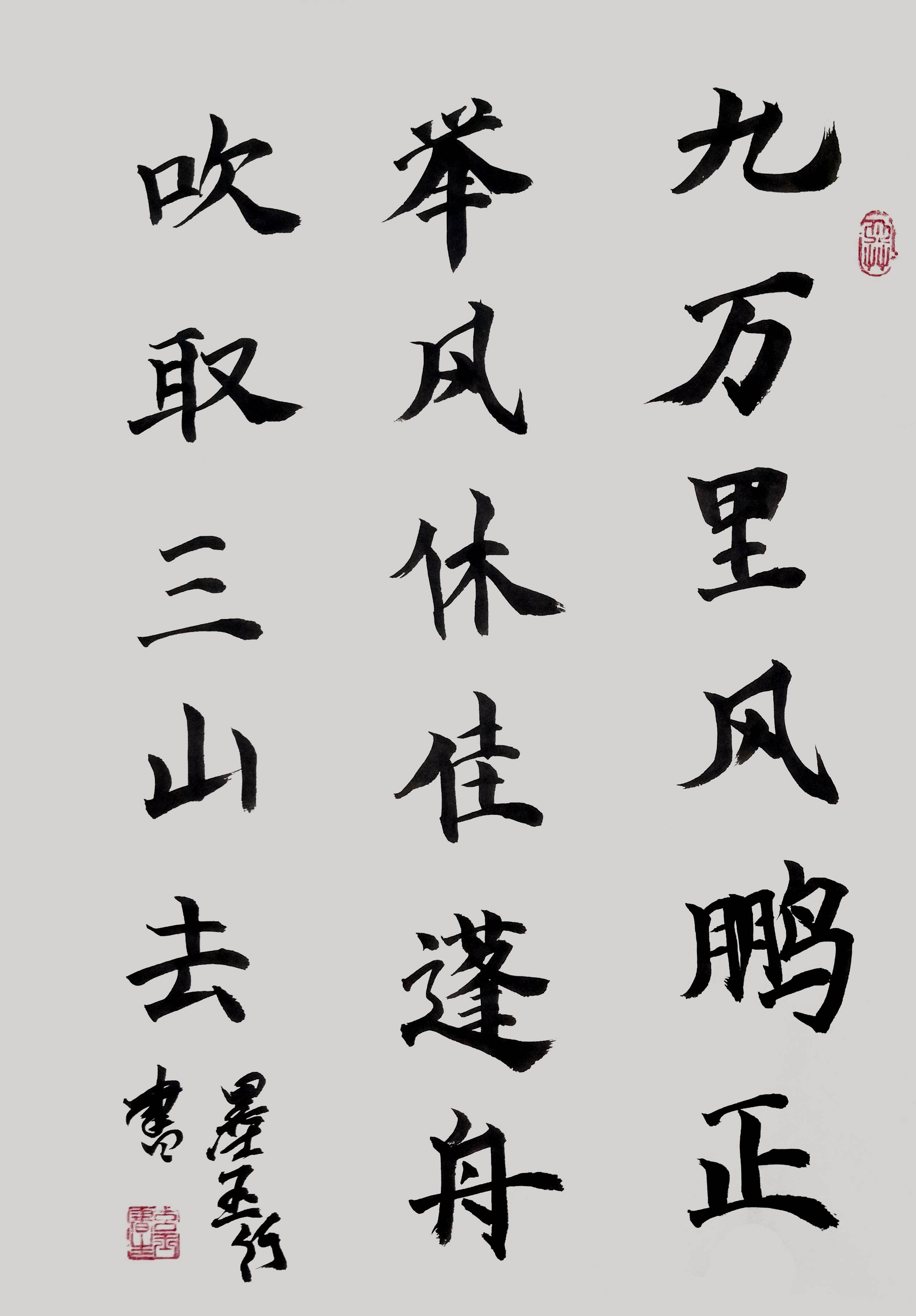 毛笔下笔果断,行笔流畅自然,犹如龙游四海,凤舞九州,观之叹为观止,习字期间不择笔不择纸不择墨不垫格不划线,视书写需要,把笔抬的高高地就写,对联,四尺作品,榜书,真草隶篆行信手拈来,正是得明师指点学到妙处,喜不自胜,故而可一心于此,精进无碍。尤其是写的天下第一正书九成宫,笔法精妙落笔很自信,最重要的是他的心境落笔提放力度适中,一撇一捺、遒劲有力,一提一顿、聚精会神,欧体的险绝与遒劲之美,在他的笔下表现的淋漓尽致。