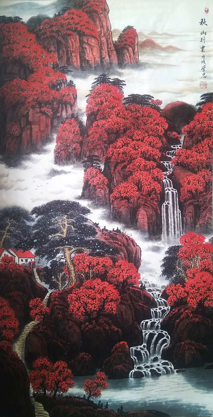 写意和具象两种风格并存,既有墨色浓重的写意画,又有细致入微的具象画。他运用墨色的变化,表现山水的层次感和光影效果,用笔灵活多变,轻重缓急、虚实相生,将自然山水描绘得淋漓尽致。在写意画中以浓重的墨色,粗犷的笔触,表现山水的磅礴气势。大山崇山峻岭,小桥流水人家,展现出博大的自然风光。同时又能运用大量的朱砂和石青,四季不同的气息。在具象画中以细腻的笔触,描绘自然山水的细节。山峦叠嶂,江水波光粼粼,船只、树木、人物等细节栩栩如生。