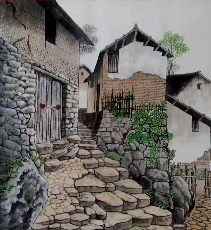 刘学忠还具有典型的“李家山水”特点。首先将素描技法,完全化入笔墨之中。他在画作中还大量运用积墨和破墨的技法,使画面更加丰富多变。同时,他还将传统山水画的勾勒、皴擦、点染等技法与现代的透视、色彩等元素相结合,形成了自己独特的山水画风。其画中的光感更强,用我们传统的笔墨表现出来了,以黑重为特点,墨黑丛中的天地也更宽。远山的墨色更润,加之浓墨重色,淡色之淡墨,都能浑然一体。他积点成线,点更圆浑,更有节奏感,积成的线也很流畅。沿袭了李可染的积墨法,墨积得又厚又润,而且更加浑然一体。黑色大山突兀,白色飞泉直下,形成鲜明的对比。其作品已然继承了李可染大师的创作精髓。