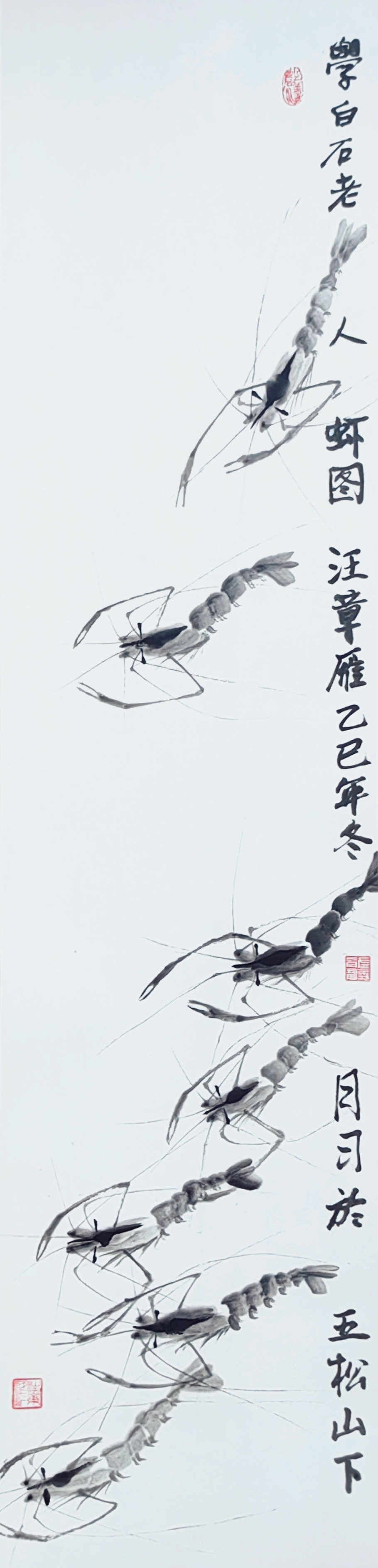 除了风景写生水墨的深厚造诣,汪章雁在水墨虾蟹题材创作上亦有独到建树,师法传统而自出新意。他坚守“师古人更师造化”的理念,深入自然观察水族生灵的动态神情,以中锋运笔、以书入画,用凝练清雅的笔墨,绘出虾之灵动通透、蟹之苍润厚重。笔下之虾,水墨淡雅、气韵生动,虾须柔中见劲、摇曳生风,仿若清水涌动,群虾相呼相应、悠然自得;笔下之蟹,墨色厚重,朴拙有趣;群虾组蟹,或并肩同游、或首尾相顾、或穿插避让,错落天成,尽显水族本能的动、静、聚、散之美态,暗合“和谐共生”的生态哲思。他的水墨虾蟹作品笔墨简练、灵动自然、极富生命活力,是传统花鸟写意在当代的鲜活延续与个性表达。