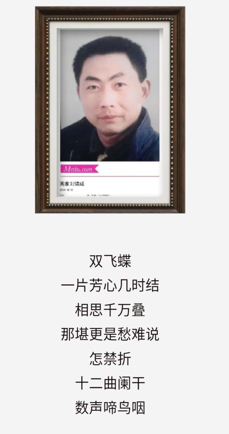 刘锦成,男,汉族,出生1964年8月15曰。江苏省盐城市响水县小尖镇人,长期定居无锡,自幼喜爱画画。师从江南画院院长邓柏良先生。作品在全国书画大赛中多次获奖,现为实力派画家,慈善记者,在2008年5月特聘为奥林匹克特约画家。天津书画杂志社驻无锡市锡山区工工作站站长,作品多次捐赠给慈善机构。现为国家一级美师,奇幻艺术画派创始人,中国美术家协会会员,作品多次在拍卖行拍卖。为世博会和十八大提贺书画家,作品拍卖。