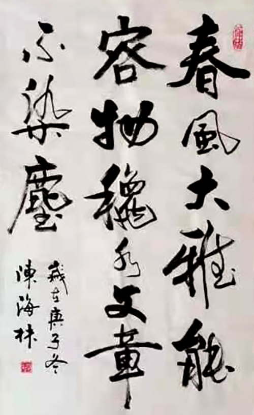 陈海林, 男, 汉族。1964年2月出生在中国鱼米之乡江苏盐城;自幼酷爱书画,四处求名师,高人指点,得到专家认可,终究有点成就。现为北京市丰台区文学艺术界联合会书法家协会会员、中国王曦之文化研究联盟研究员、江苏省老年协会书法研究会会员、盐城书法家协会会员;曾多次在书法大赛中荣获荣誉。2020年先后在全国第二届“”书圣杯“”书画大赛中荣获优秀奖、银奖、在翰墨百家“兰亭序”全国书画艺术大赛中获得奖项、在“”翰墨名人”艺术大赛获奖等等。