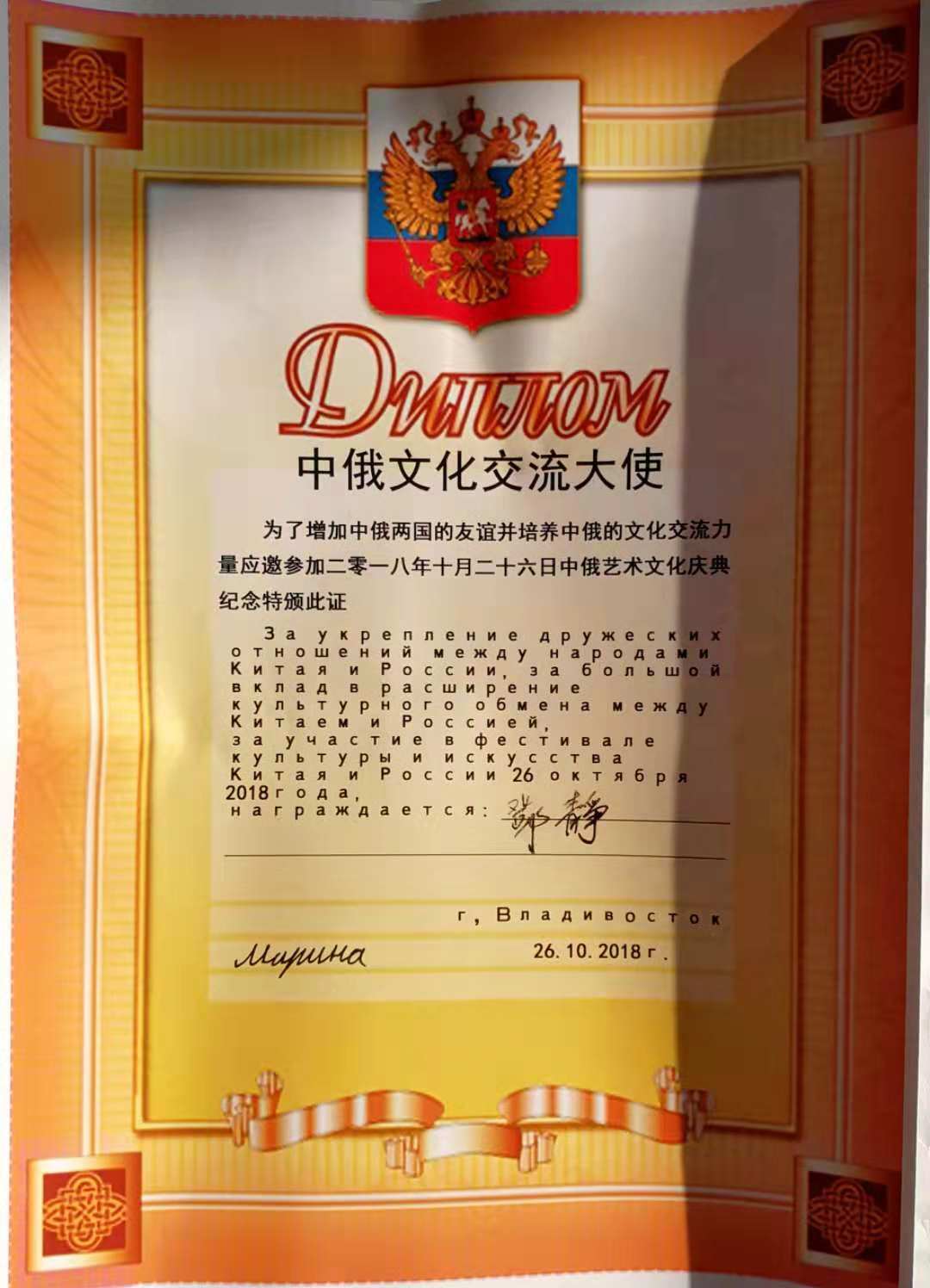 俄方为我们参加文化交流的17位画家颁发了中俄文化交流大使证书。