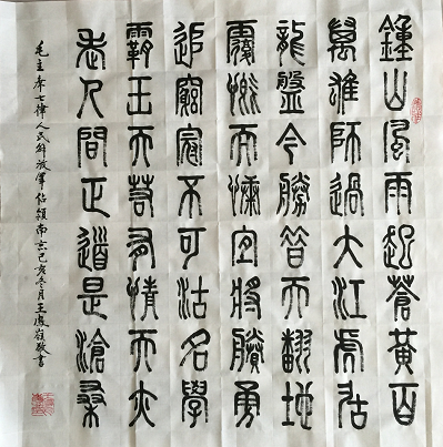 自幼以名帖为师,50多年来潜心研习中国书法篆、楷、隶、行书之精髓,从诸帖中吸取营养,习书不缀。近年来主要研习篆书,兼修楷、隶、行书,并寻求新的表现手法。