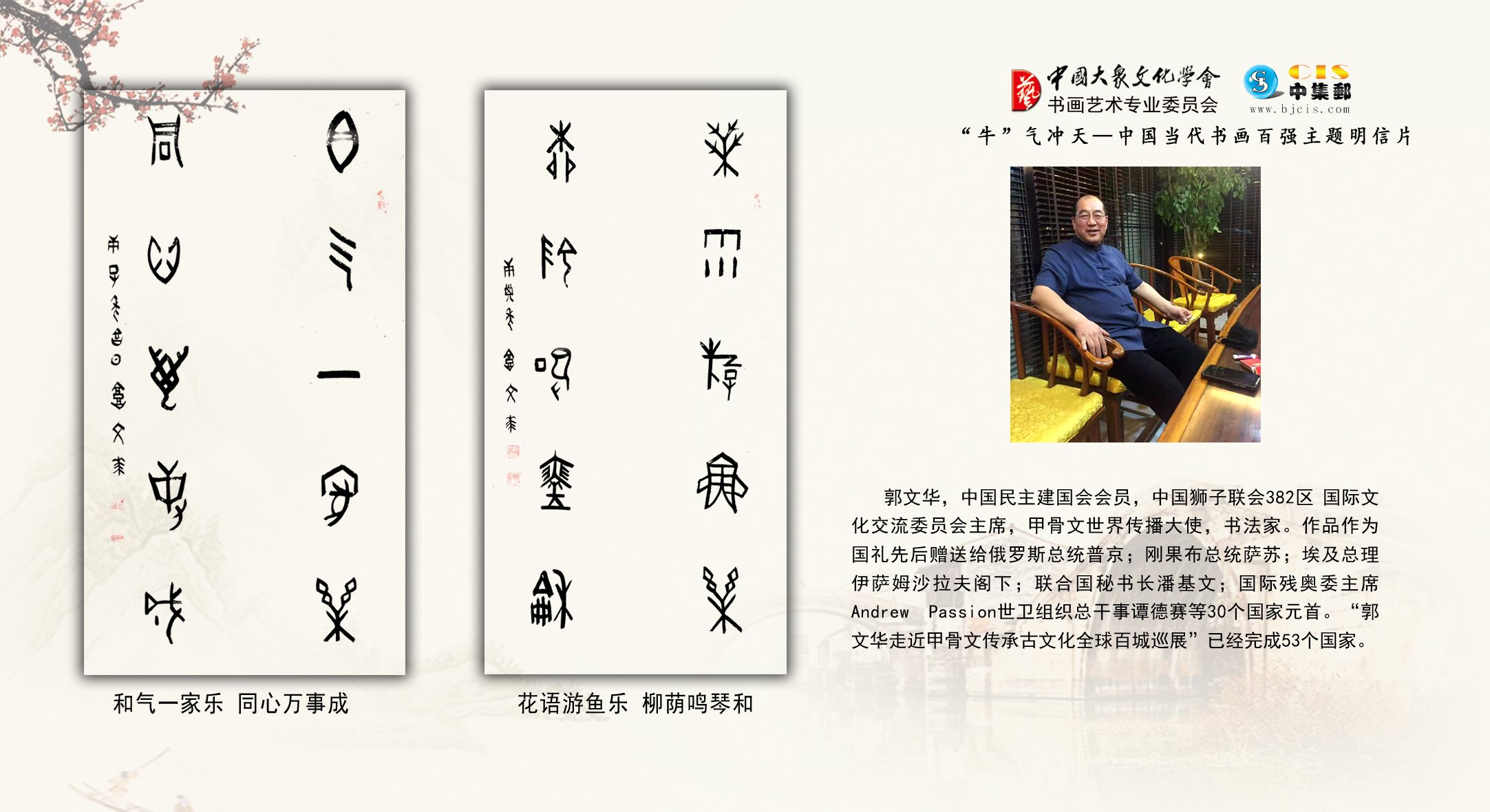 “郭文华 走近甲骨文传承古文化 全球百城巡展”已经完成53个国家。21个机场国际厅 出港或入港,悬挂郭文华写的甲骨文书法作品。