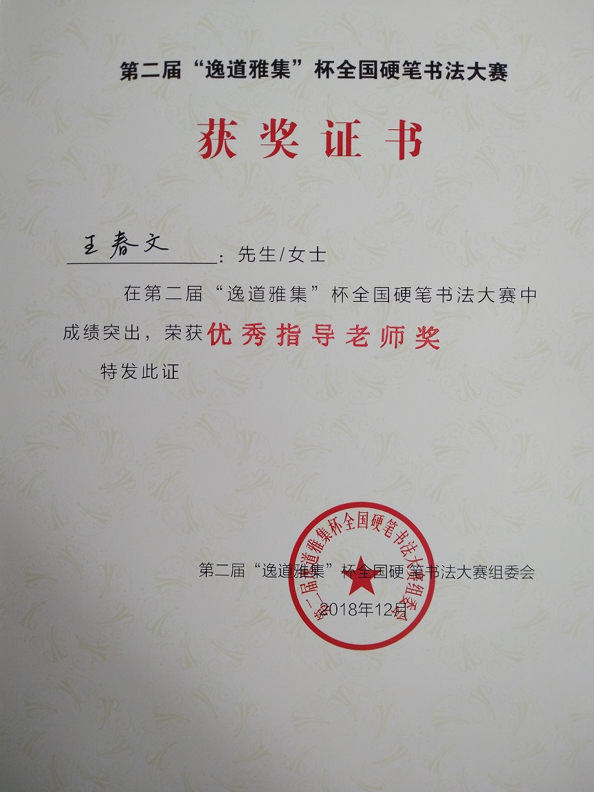 2018年获第二届“逸道雅集”杯全国硬笔书法大赛入选奖并授予“优秀指导老师”荣誉称号