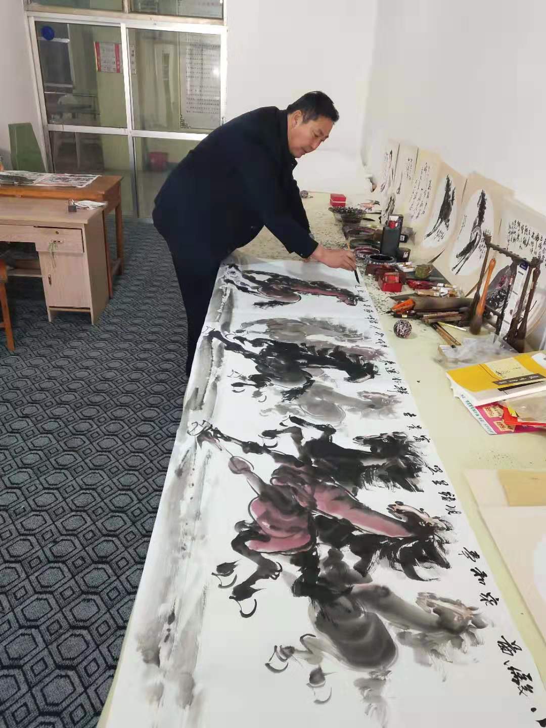 受阎先公,袁相富,自枚等老师教诲,艺术不断提高。尤爱画马,骆驼等花鸟画,多次参加国家,省,市书画展并获奖。近期创作的三十米长卷-《百骏图》,百米长卷-《万马奔腾》等巨幅作品以被国内收藏家,企业家收藏,他的大写意马,画艺高超具有时代感,深受书画爱好者,收藏家,社会各界的好评。