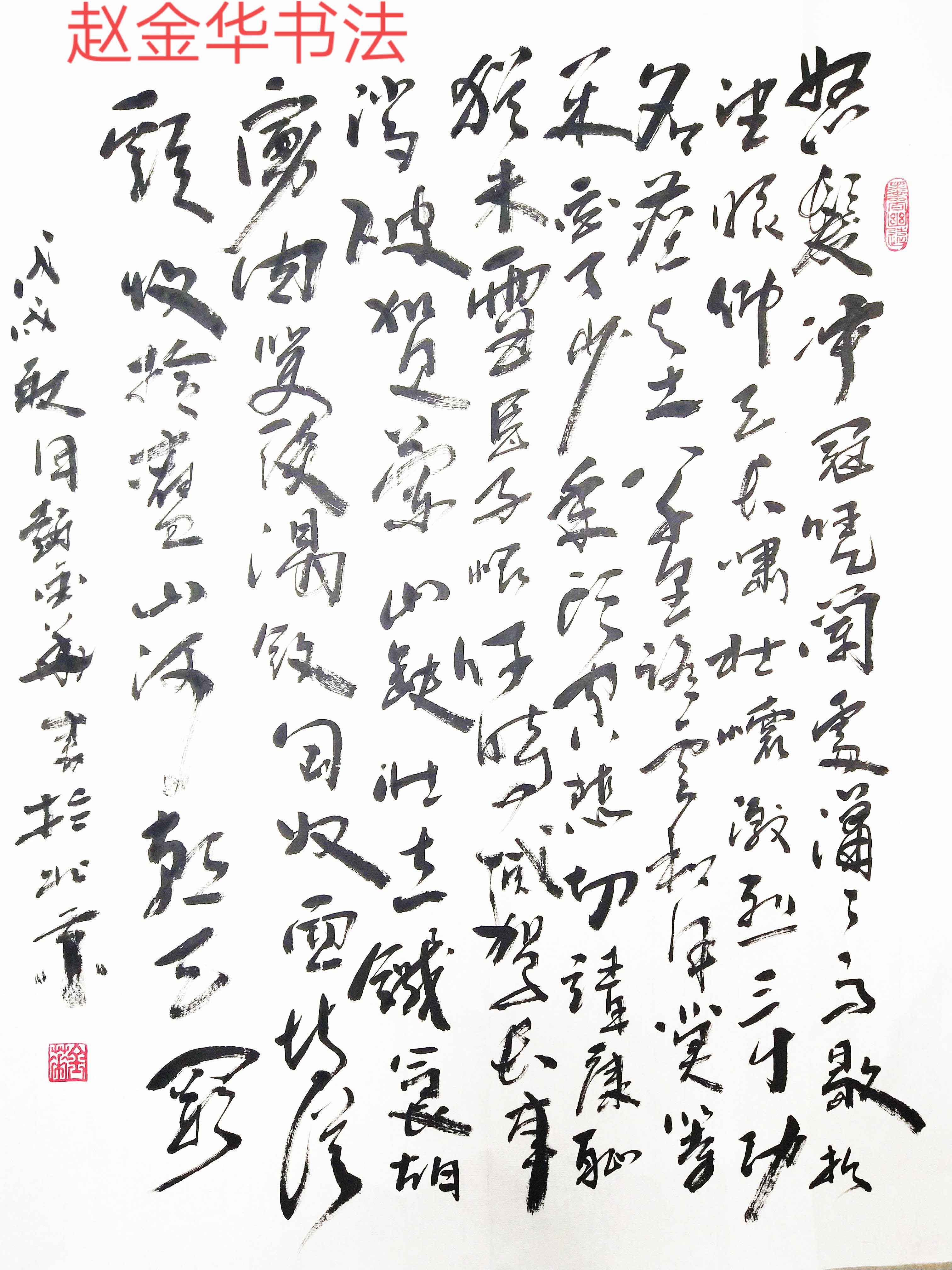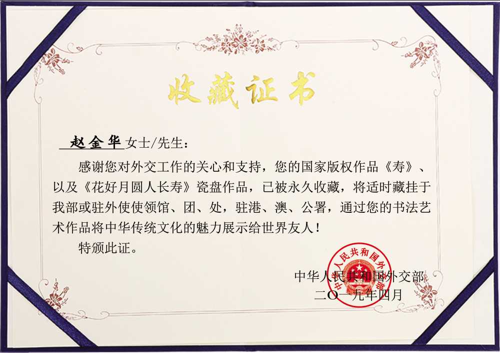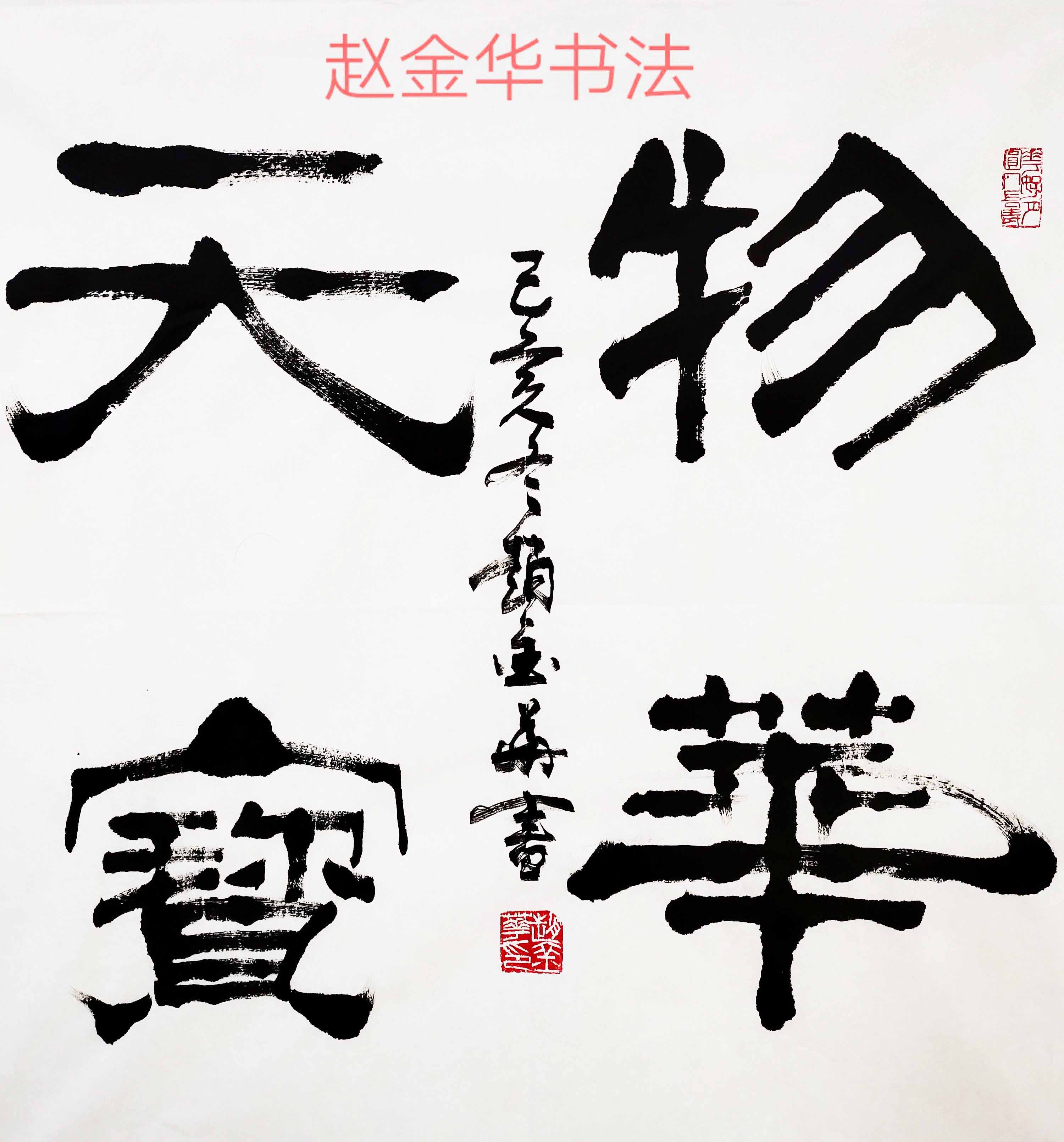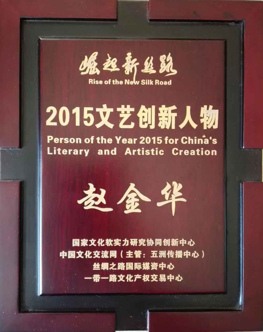 作的部分书法作品被喜迎中国共产党十九次代表大会主题《中国邮册》收录,并被中国邮政制作成邮票发行,2018年1月1日,在习近平主席发表新年贺词的文化部机关党报《中国文化报》上以赵金华“胸有家国、落笔乾坤”为题整版报道,2018年4月作品入编中国文联出版社出版的《中国艺术传承人物》,并为本刊题写封面,2018年1月20日,赵金华先生与全国人大常委会副委员长顾秀莲在中央机关老将军老部长新春联谊会上,共同为黄潢书记、徐寿增中将颁发自己创作的《花好月圆人长寿》作品,2018年4月24日赵金华先生在青海省民建省委举办的中共中央发布“五一口号”七十周年书画作品展中被青海省文联、青海省民建省委授予特等奖,2019年1月,赵金华先生的作品被钓鱼台国宾馆收藏,并作为国礼送给参加阅兵的各界人士,2019年1月与中国书法家协会主席苏士澍共同出版《中国当代书画名家》一书,2019年3月赵金华先生被评为“聚焦两会特殊贡献人物”荣誉称号,2019年4月赵金华先生国家版权《寿》字作品以及《花好月圆人长寿》寿字瓷盘作品被中华人民共和国外交部永久收藏,2019年7月,赵金华先生被塞拉利昂共和国授于中塞友谊文化大使称号!2019年11月1日,赵金华先生被特邀座客吉林卫视《聚星汇》栏目。