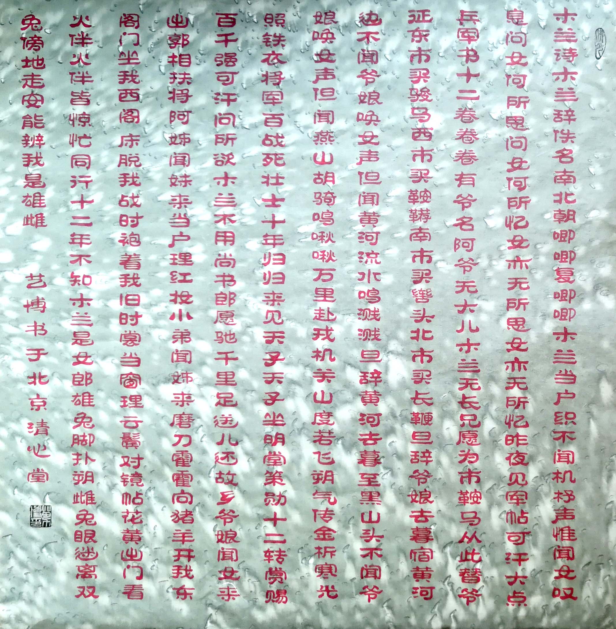 源于传承,善于领悟,其主要作品有,道德经、三字经、千字文、弟子规、兰亭序、唐诗宋词;在内容意境中糅和书法精神,并通过线条与布局,巧妙地解读书法的文化内涵,行笔自然真淳,气象多元,有雅有拙。作品因意境涵义而多变,有长城型、葫芦形、蝴蝶型、地图形、宝塔型、心型等等,表现出对传统文化的追求与个性新意的创造,作品中展现出创造的形态美和意境美。多次参加公益活动,深受欢迎,许多作品被企业家和国际友人收藏。