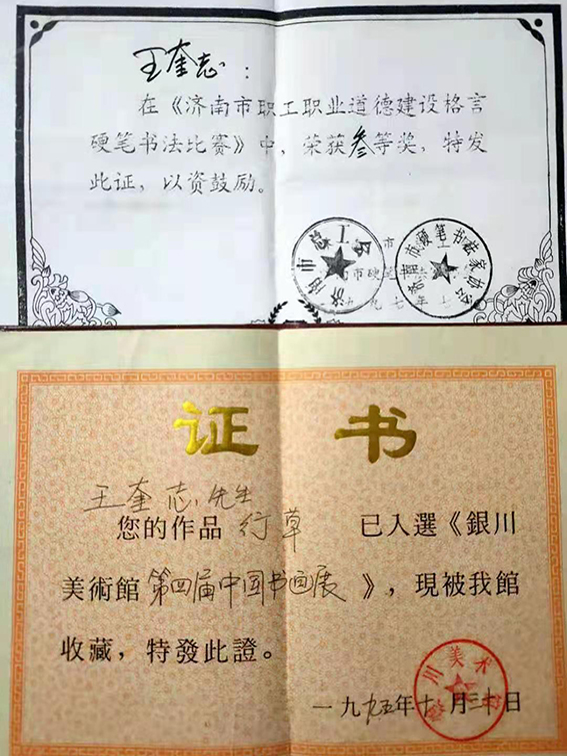 1995年,第四届中国书画展大赛行草书被国家永久收藏;