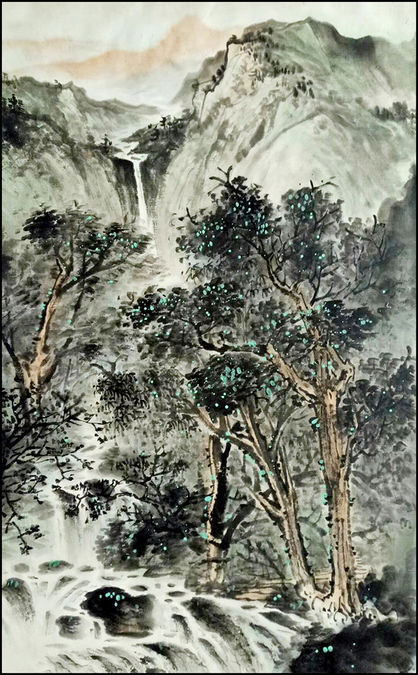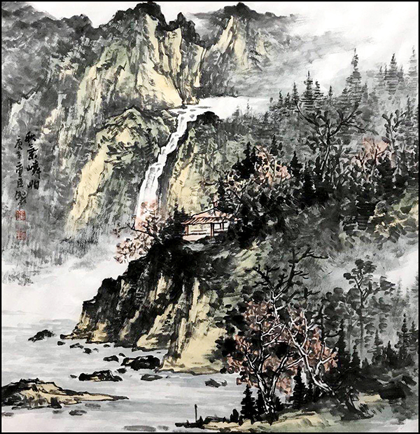 其山水画作,山高水奇、云雾缭绕,树木毓秀,帆影悠然。笔触细腻,画风清幽,带给观赏者的不仅是视觉上美的享受,更给人以心灵与精神上的净化。让人感受到大自然的和谐灵动与美妙,使人在欣赏画作过程中,感觉到山水的妖娆美丽,不知不觉置身于山水之间,与自然融为一体。